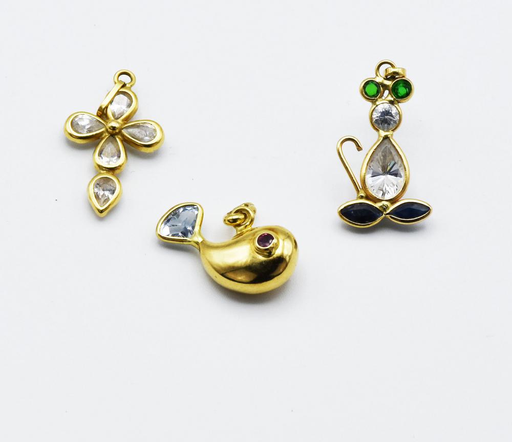 LOTTO DI TRE PENDENTI IN ORO GIALLO, ZAFFIRI E PASTE VITREE modellati a forme...