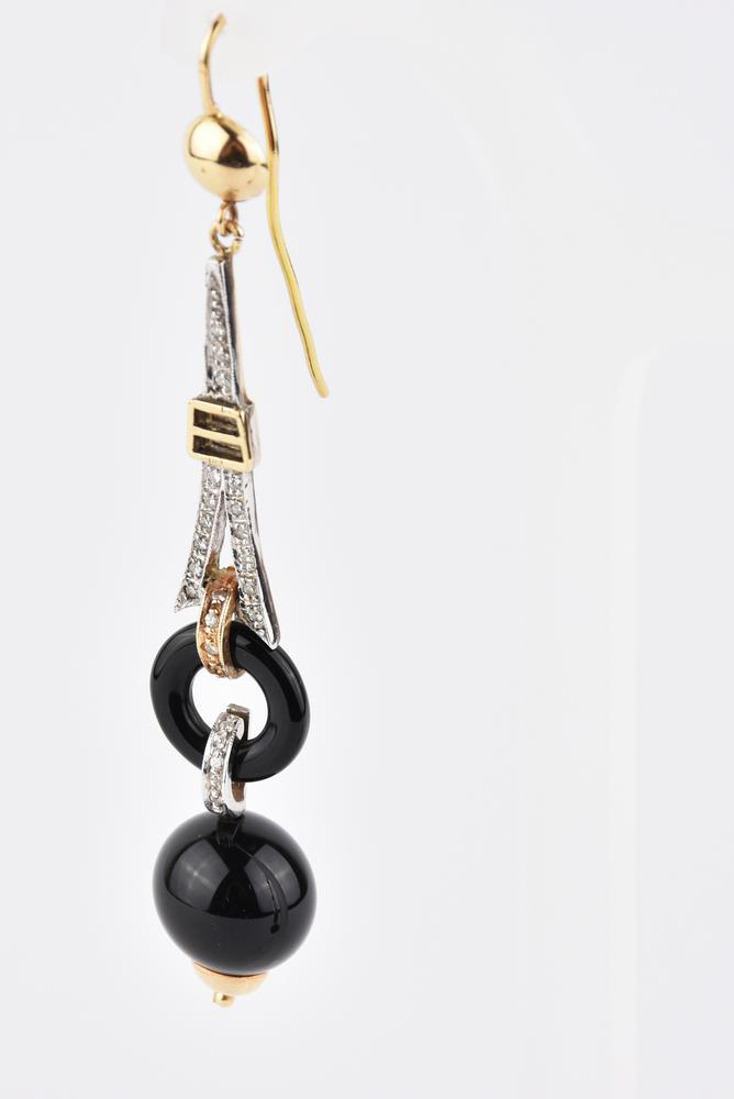 PAIO DI ORECCHINI PENDENTI IN ORO A BASSO TITOLO, ONICE E DIAMANTI