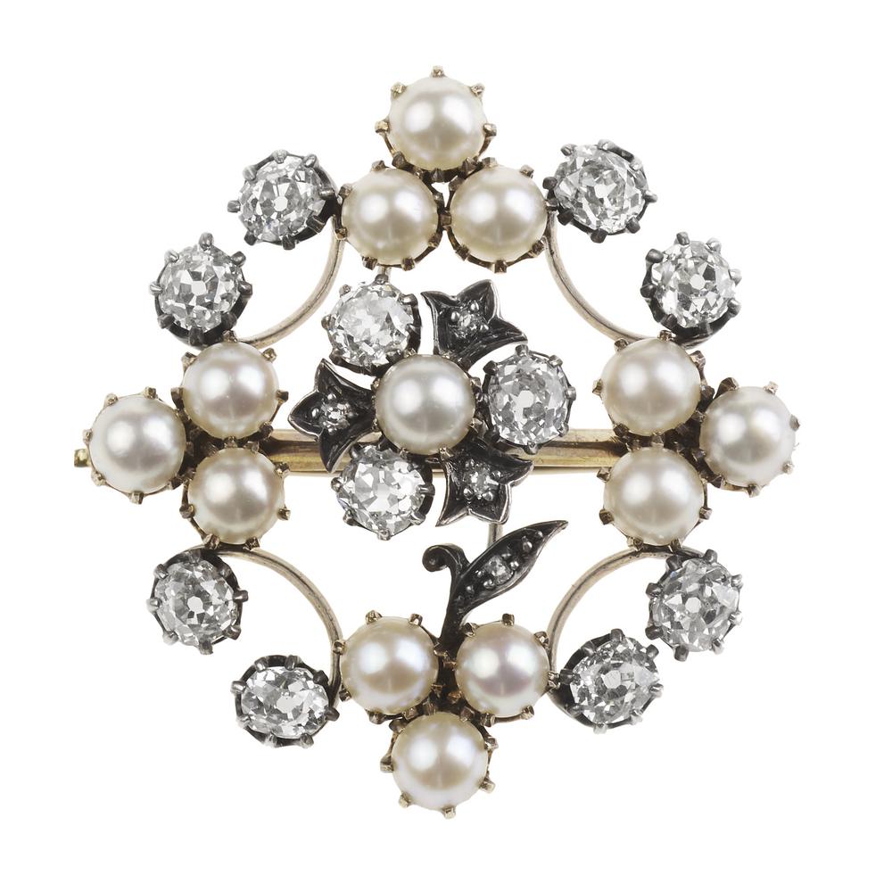 SPILLA IN ORO GIALLO, ARGENTO, DIAMANTI E PERLE NATURALI