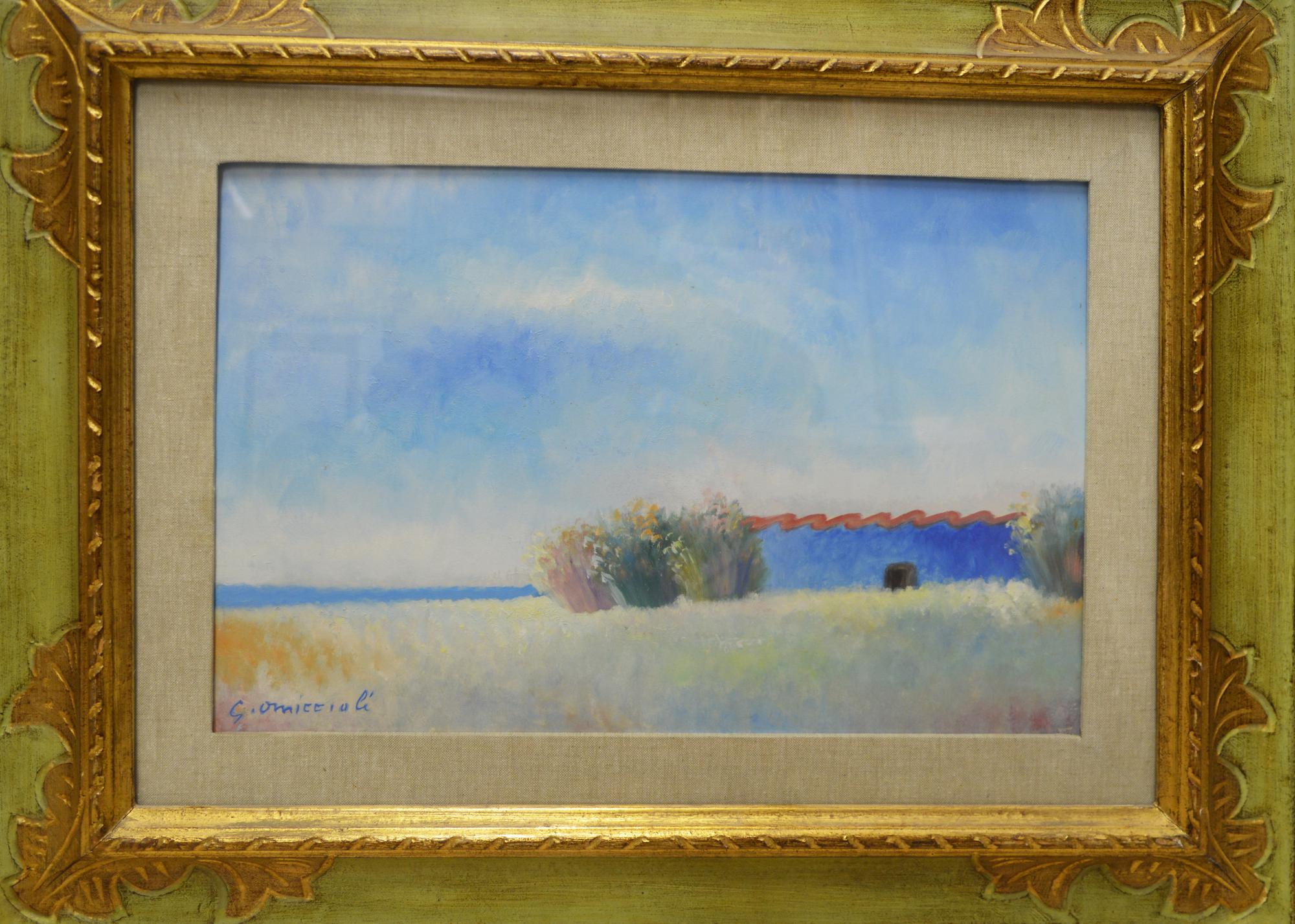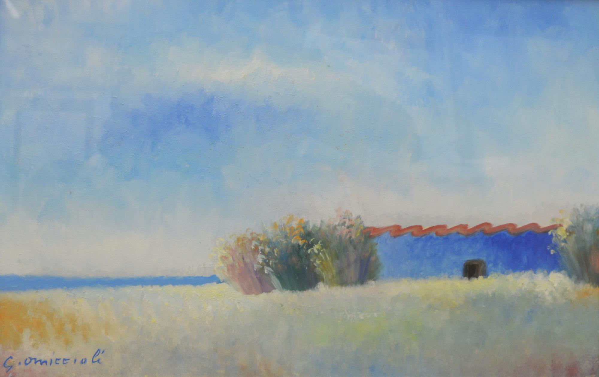 Giovanni Omiccioli BARACCA BLU A PASSOSCURO olio su cartone, cm 35,5x50,5...