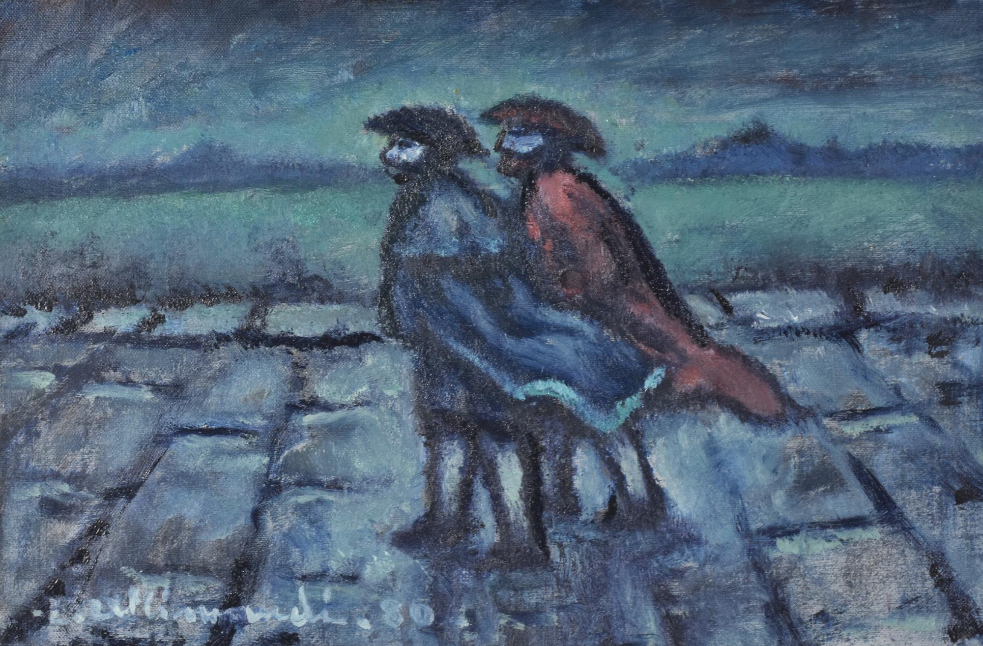 Enrico Allimandi MASCHERE olio su cartone telato, cm 30x45 sul fronte: firma...