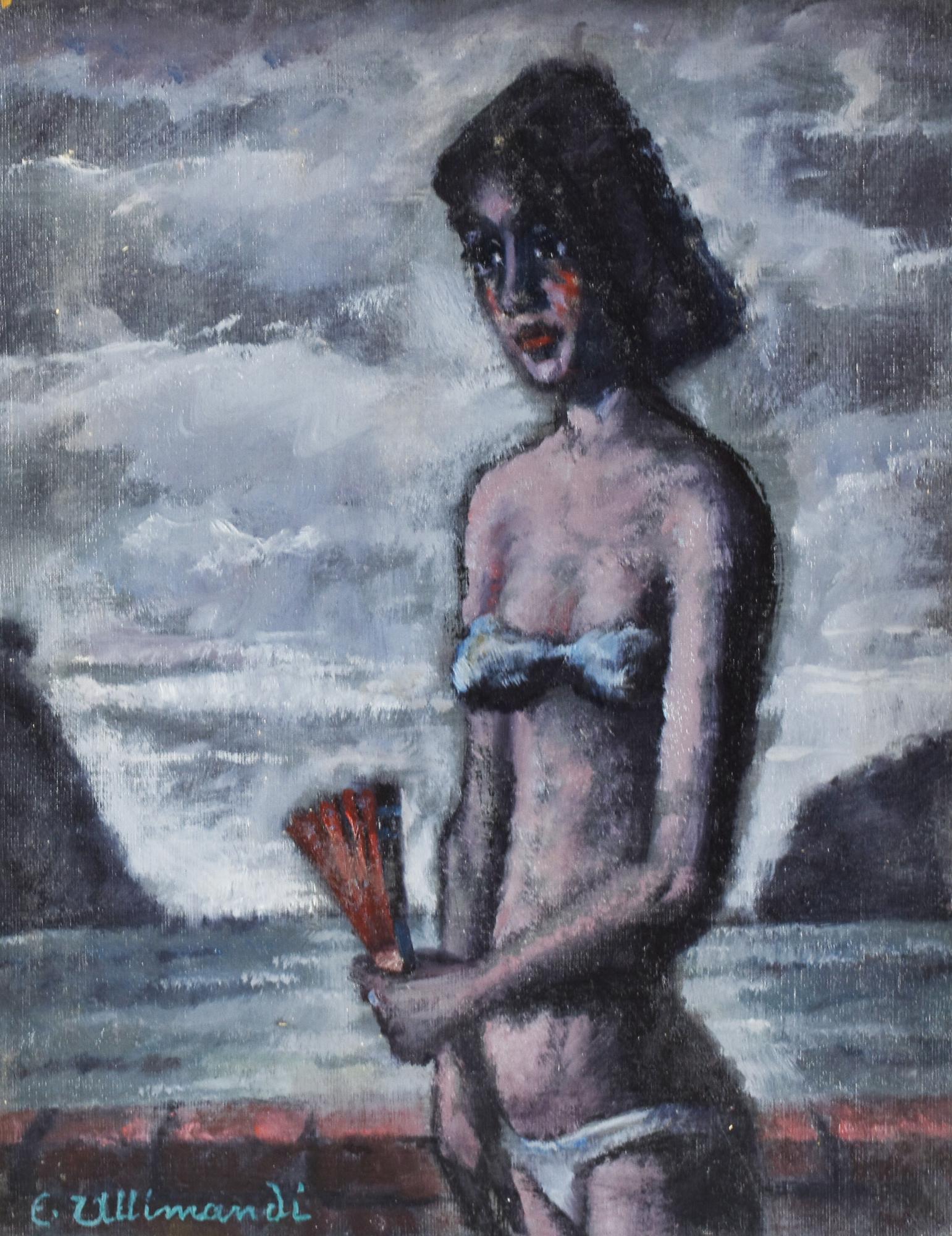 Enrico Allimandi RAGAZZA CON VENTAGLIO olio su cartone telato, cm 45x35 sul...