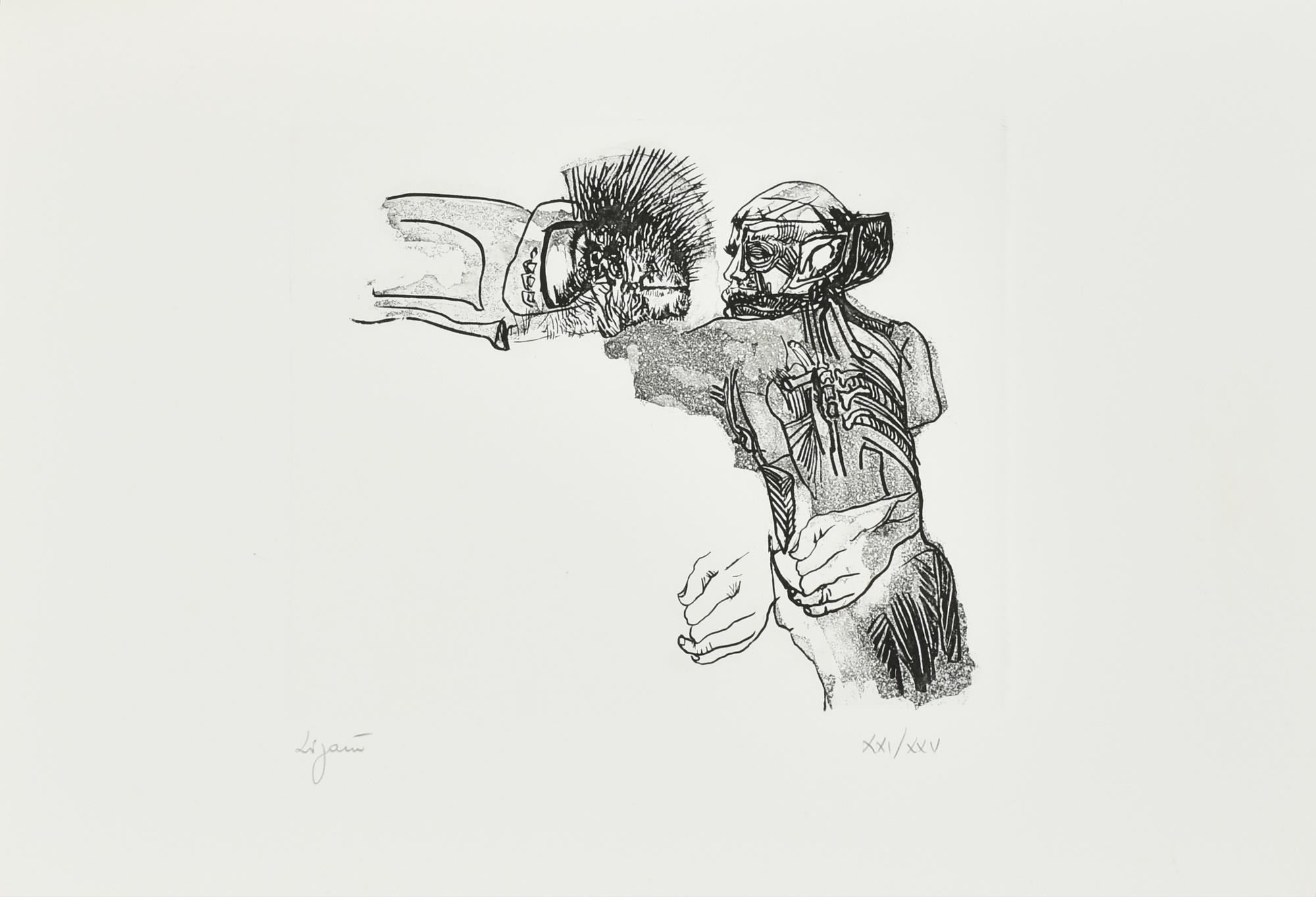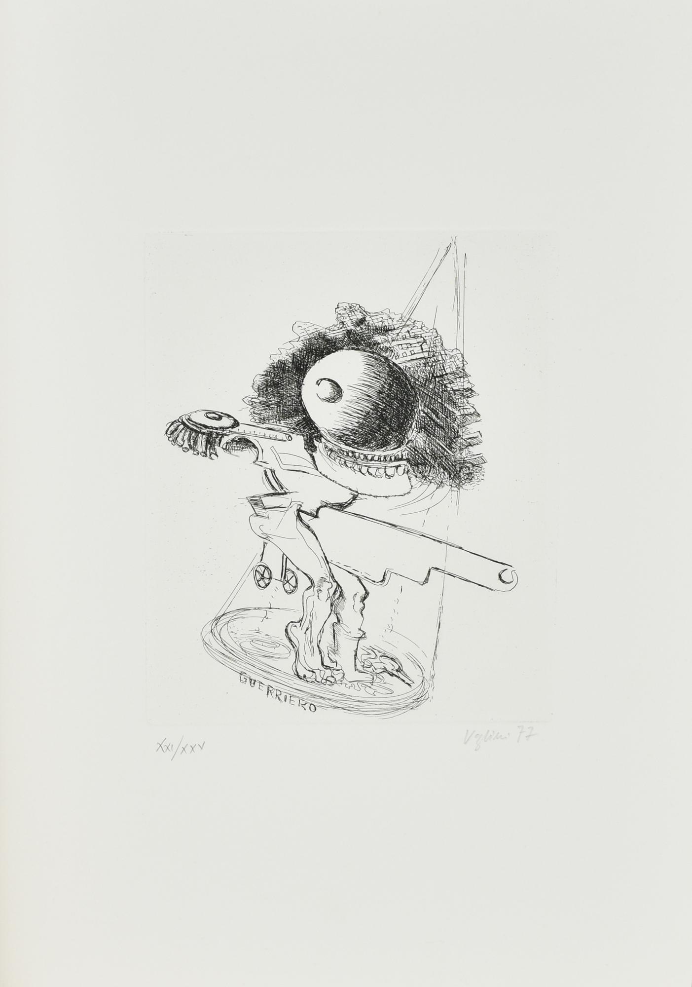 - Tino Veglieri, Guerriero alle Porte della Città, acquaforte su carta, battuta cm 24x20, foglio cm 50x35