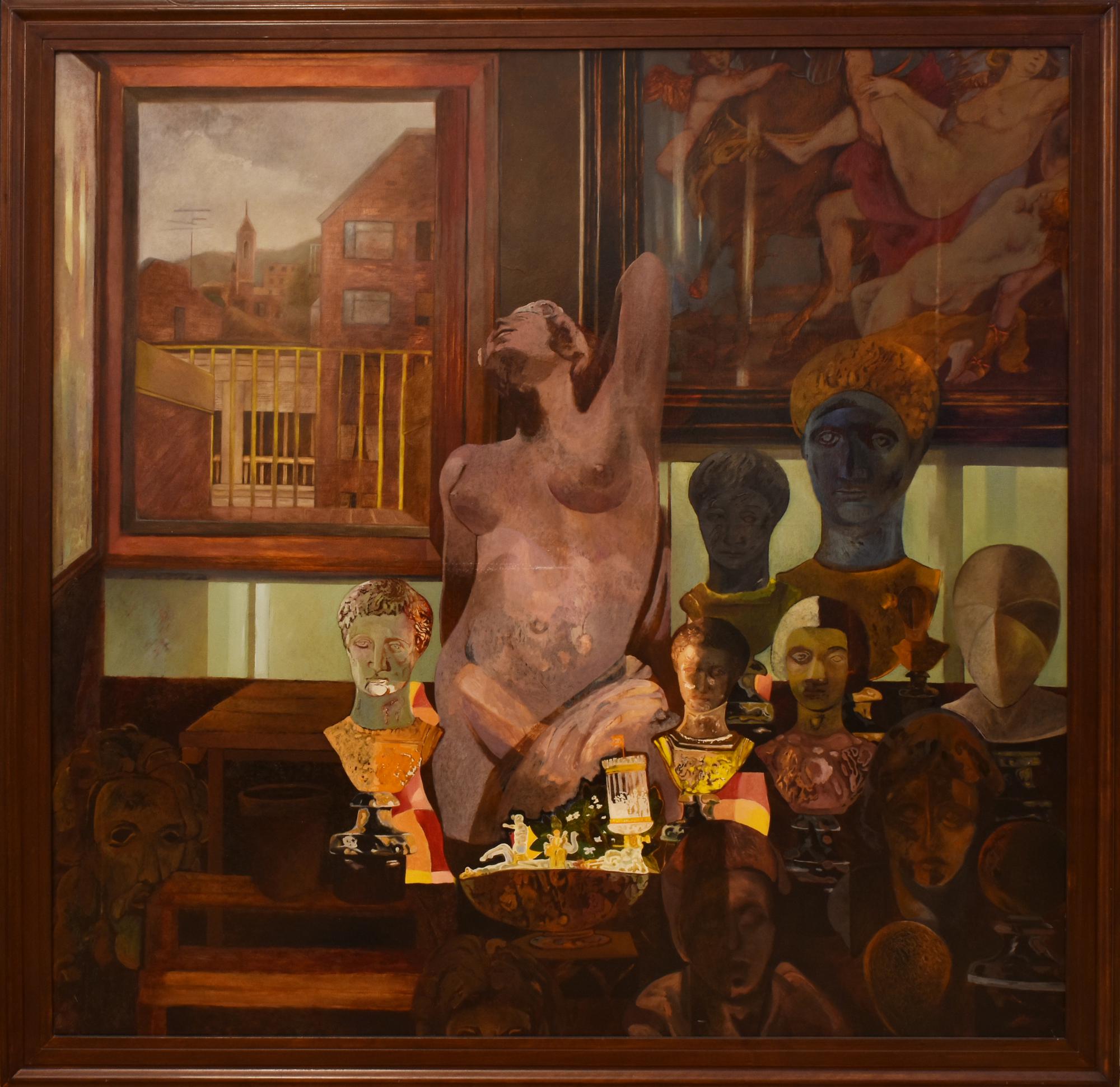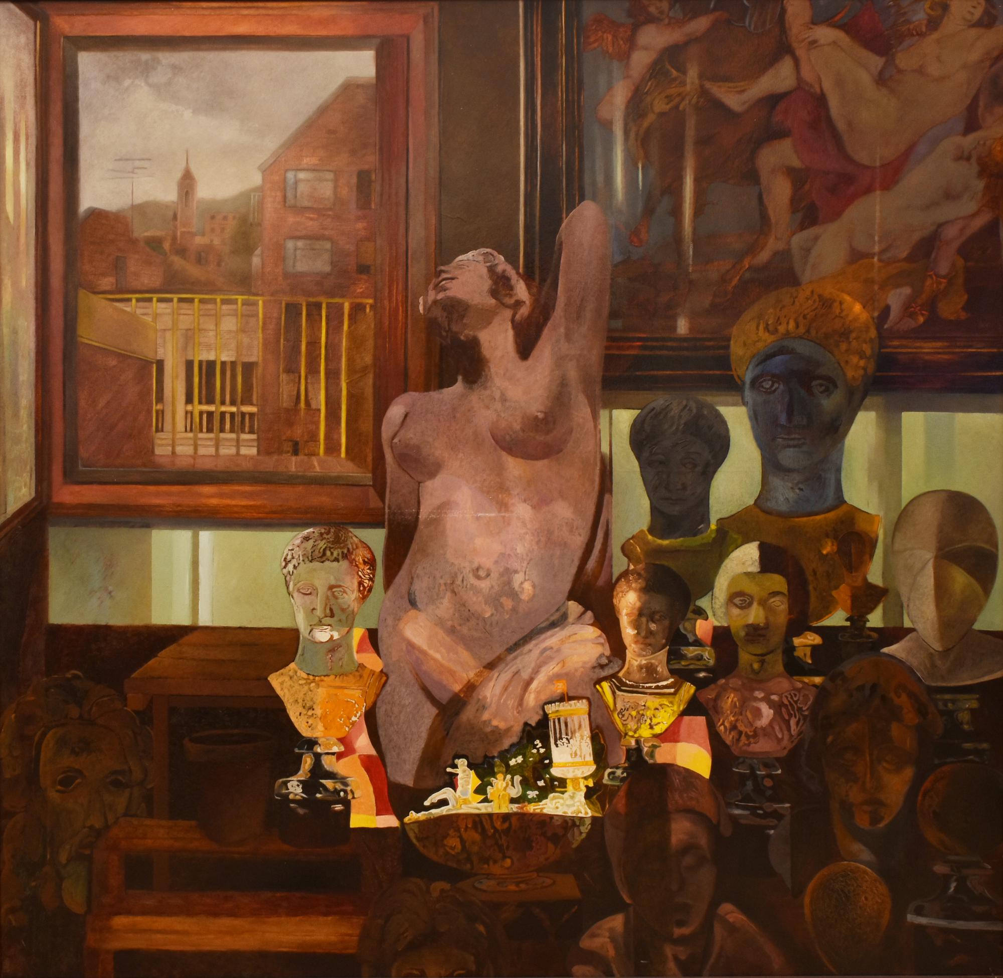 Max Pellegrini LA CASA DEL COLLEZIONISTA olio su tela, cm 150x150 sul retro:...