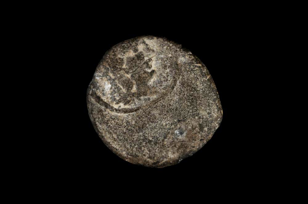 Piccola tessera circolare coniata con una testa maschile a sinistra da un lato ed un leone gradiente a destra dall'altro