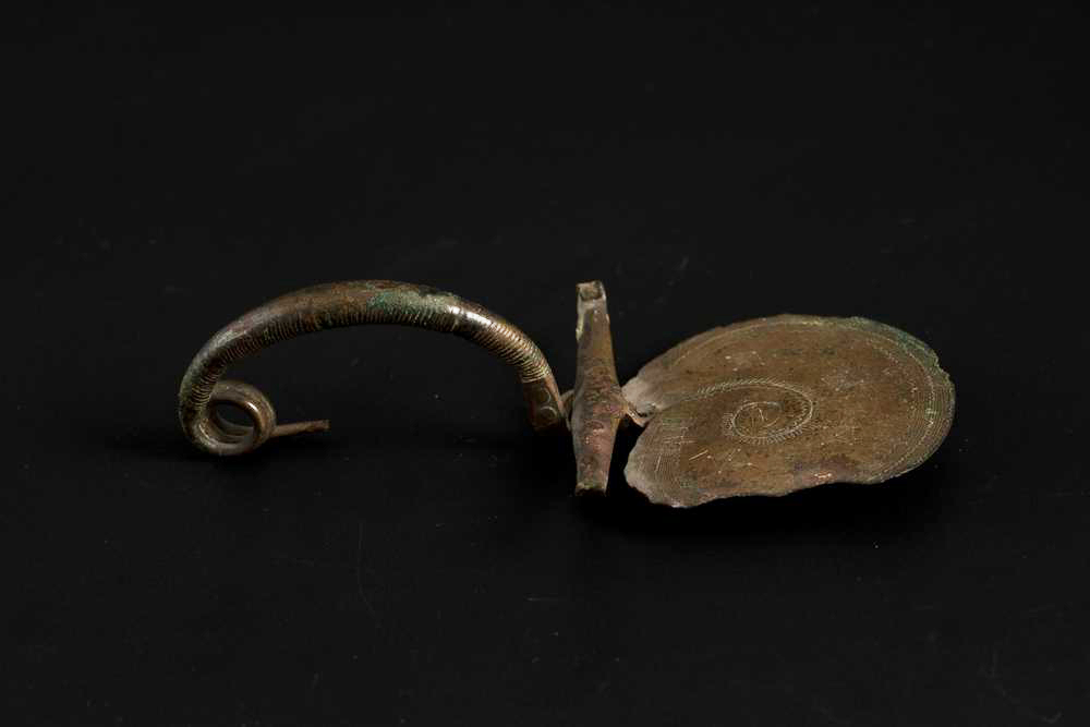 Grande fibula a disco con arco semplice decorato a gruppi di incisioni parallele, molla a tre giri, ardiglione lacunoso e grande staffa a disco decorata ad incisione sul bordo con gruppi di linee concentriche, e motivi a zig-zag, sul disco con quattro quadrati campiti da linee e coppelle angolari, al centro con motivo a spirale