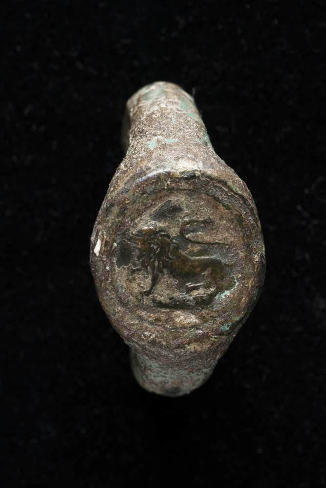 Anello in verga di bronzo a sezione cilindrica con castone ellittico decorato con un leone seduto a destra