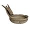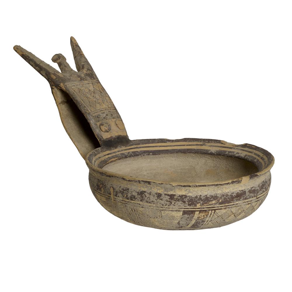 Fondo apodo, ampia vasca a parte convessa con orlo inserito a terminazione obliqua. Ansa cornuta con decorazione plastica, forse antropomorfa. All'interno della vasca due volatili contrapposti. Decorazioni geometriche sull'ansa e la vasca
