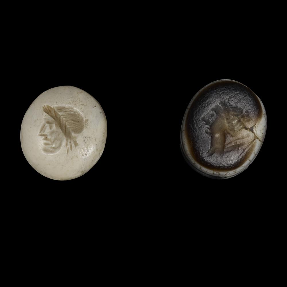 Due castoni ellittici incisi, uno con una maschera teatrale tragica di profilo a sinistra e l'altro con testa femminile a sinistra con capelli raccolti in uno chignon sulla nuca (2)