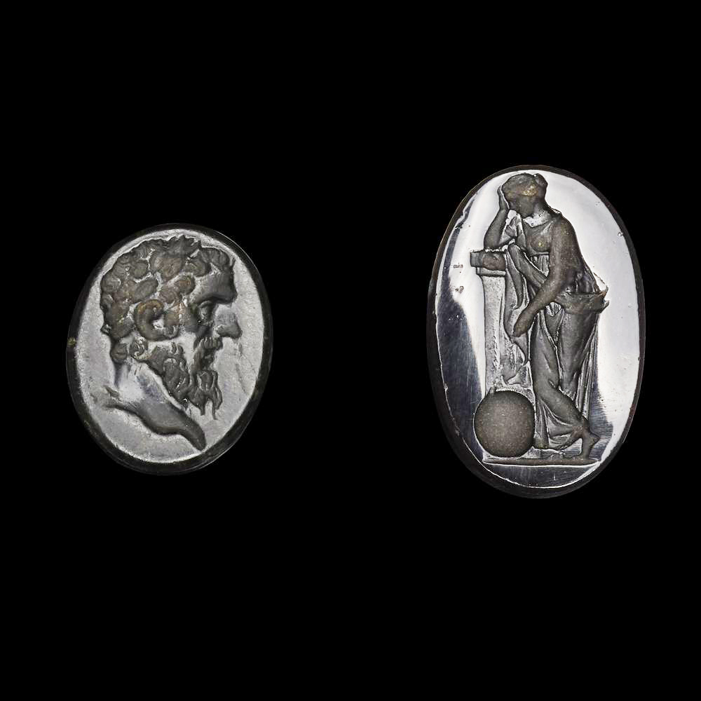 Castone ellittico inciso con busto maschile laureato, barbato a destra probabilmente Giove; altro castone ellittico con la Musa Urania appoggiata con il gomito a un pilastrino a sinistra, si regge il capo e punta un bastone verso una sfera ai suoi piedi (2)