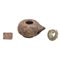DESCRIZIONE: lucerna romana monolicne, bocchello di unguentario vitreo e tessera da gioco (?) in terracotta