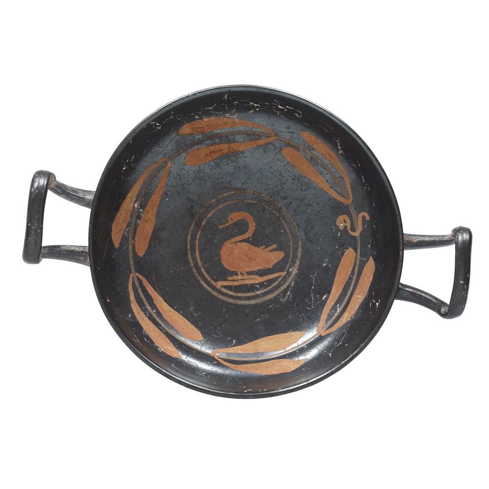 Kylix con vasca a profilo arrotondato con lievissima risega all'interno, anse a bastoncello impostate obliquamente sotto al bordo e ritorte verso l'alto; piede troncoconico modanato