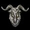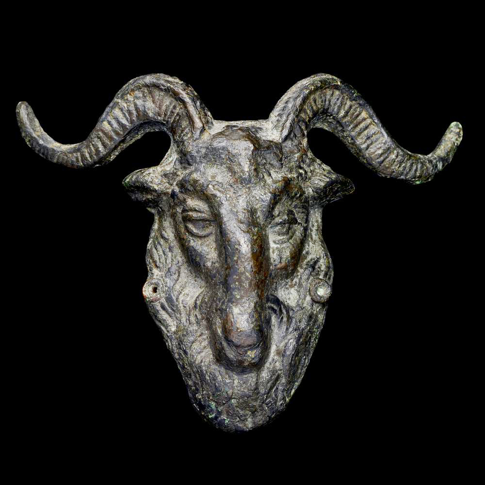 Grande applique in bronzo vivacemente modellata come una testa di ariete con lunghe corna ritorte, muso triangolare, piccole orecchie e folto vello alla base della testa