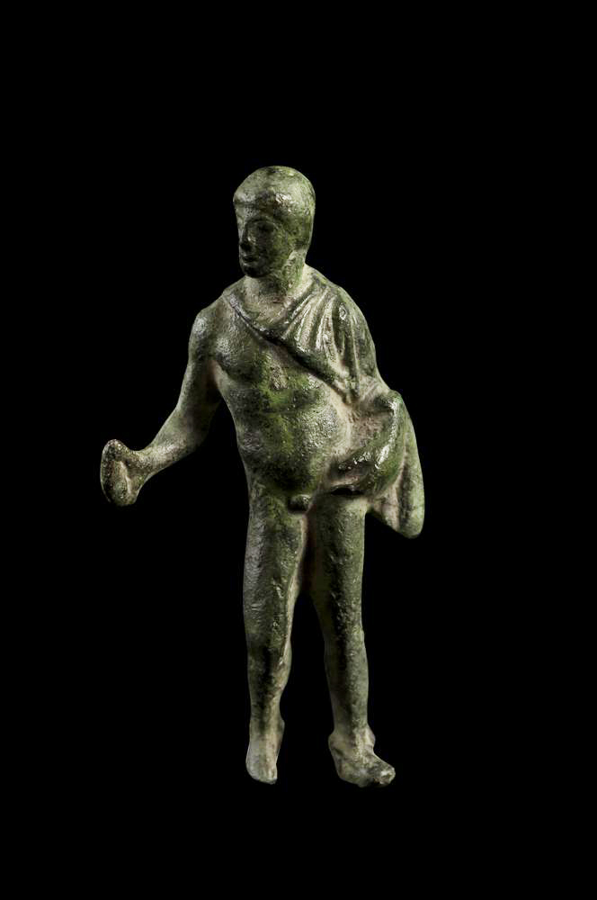 Piccola statuetta votiva raffigurante Mercurio nudo, il dio è leggermente volto a destra, ha il mantello drappeggiato sulle spalle e sul braccio sinistro, tiene un oggetto nella mano destra