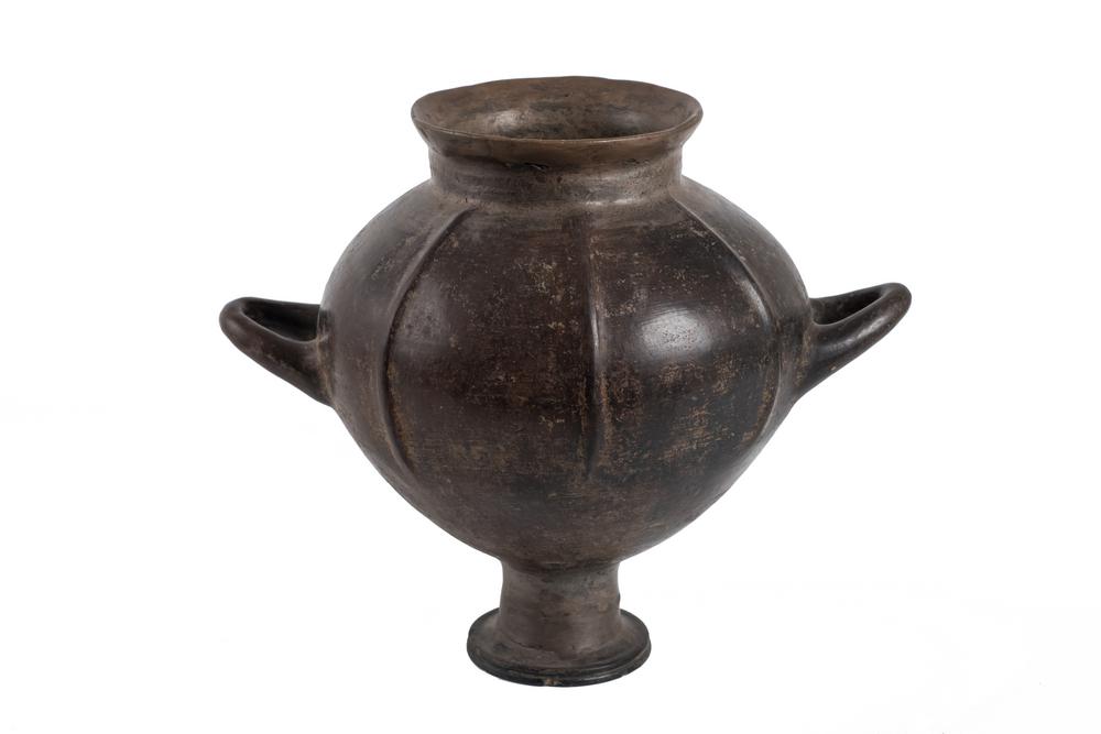Olla con ampio orlo svasato, collo cilindrico distinto, corpo biconico, alto piede a tromba; anse a bastoncello insellate, impostate obliquamente sulla massima espansione, decorata sul ventre da costolature verticali