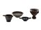 Piccolo cratere a campana con orlo fortemente aggettante, alto piede cilindrico modanato ed anse a bastoncello ritorte verso l'alto; coppa con vasca troncoconica molto profonda e piede a disco; skyphos con orlo arrotondato, anse orizzontali e piede ad anello; coppetta biansata con orlo arrotondato, anse orizzontali a bastoncello e piede troncoconico (4)