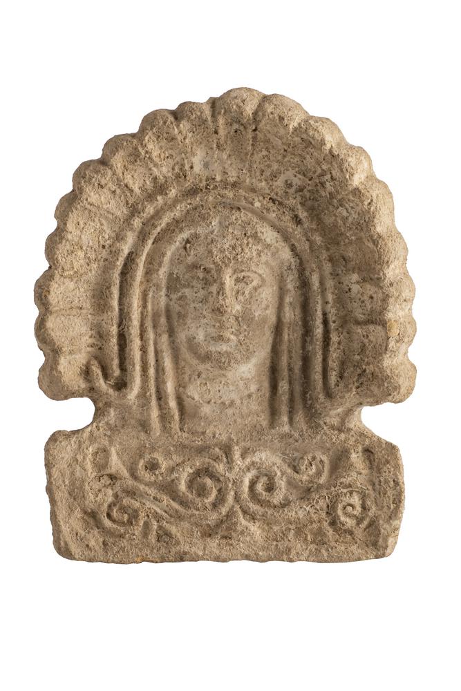 Testa femminile frontale stilizzata con collana di perle circolari entro nimbo a linguette con perlinatura nella parte interna; nella parte inferiore volute contrapposte entro spazio metopale