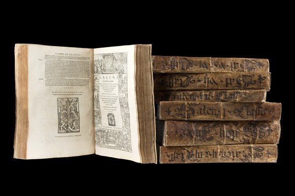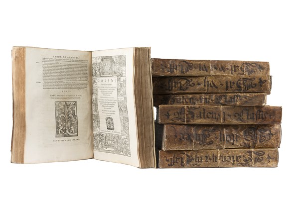 13 tomi in 7 volumi, folio (358 x 245mm). Così composti: Volume 1: Frontespizio generale stampato in rosso e nero a cui seguono le carte preliminari; Spurii Galeno ascripti libri; Isagogici libri; Operum Fragmenta; [Galeni extra ordinem] Volume 2: Prima classis; Volume 3: Secunda, Tertia classis; Volume 4: Quarta classis; Volume 5: Quinta; Sexta classis; Volume 6: Septima classis; Volume 7: Index. (Manca il frontespizio degli Extra Ordinem al primo volume e alcune carte bianche, i frontespizi del I e del VI volume hanno sofferto alcuni danni da acqua e presentano restauri e integrazioni, minori difetti anche ai restanti, internamente si segnalano lievi ripari con integrazioni a piccoli fori di tarlo agli angoli esterni inferiori e superiori, alcune bruniture e macchie, e alcune gore d'acqua limitate ad alcune sezioni). Legatura coeva in pergamena floscia con titolo manoscritto al dorso in gotica rimontata (sguardie moderne, qualche macchia, alcuni restauri e titolo sbiadito al primo volume). Data la complessa collazione dell'opera si vende non passibile di storno. Provenienza: alcune annotazioni coeve. (7)