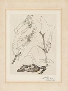 Salvador Dalí Figueras 1904 - 1989 Les chants de Maldoror Heliogravure ritoccata a puntasecca, cm. 22,3x17 Firma a matita sul margine in basso a destra: Dalì. Certificato su foto di F. Petit, con timbro Galerie André- François Petit, Paris. Bibliografia: Salvador Dalí. Catalogue Raisonné of Etchings and Mixed-Media Prints. 1924 - 1980, Edizioni Prestel, 1994, p. 130, n. 21 (illustrato altro stato).