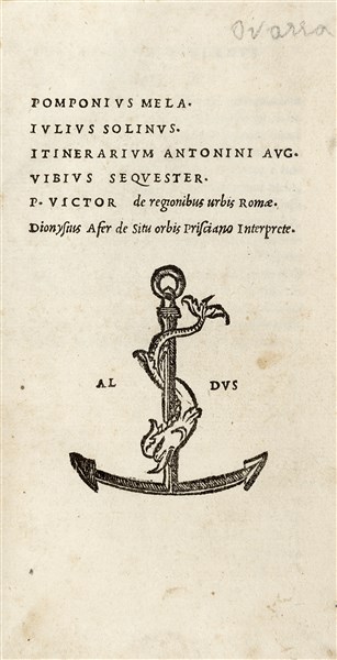 Prima e unica edizione aldina di questa raccolta di antichi testi di geografia e cosmografia. Mentre il De situ orbis di Mela, la più antica opera latina di geografia, e il Polyhistor di Solino, con notizie strane e curiose su vari paesi del mondo, erano già stati pubblicati in precedenza, le altre quattro opere appaiono qui per la prima volta. Particolarmente interessante è il De regionibus urbis Romae di Publius Victor, una specie di guida della città sotto forma di dettagliato elenco dei principali edifici, monumenti e vie dell'antica Roma.