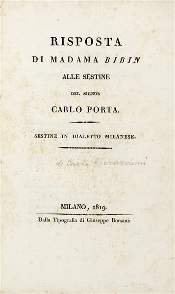 Prima edizione dell'adesione del Porta al romanticismo in cui il poeta meneghino, dialogando con "madama Bibin" espone le ragioni della parte romantica nella faida allora aperta con i classicisti. Nel lotto viene aggiunta la risposta ironica della Bibin, a firma di Gherardini, in cui viene invece difesa la parte classicistica e in particolare l'unità di tempo, di luogo e azione che la poesia romantica considerava ormai abolita. Una bella testimonianza delle discussioni letterarie che caratterizzarono l'Italia e l'Europa ad inizio '800.