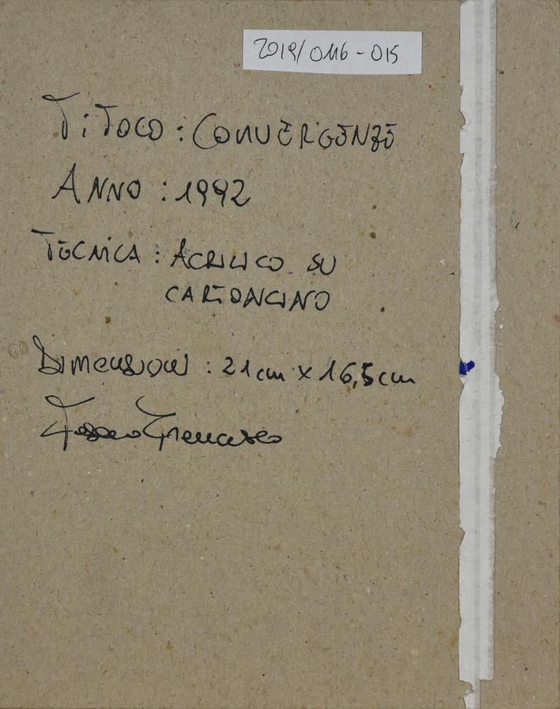 Francesco Fasano CONVERGENZE acrilici su cartoncino, cm 21x16,5 sul retro:...
