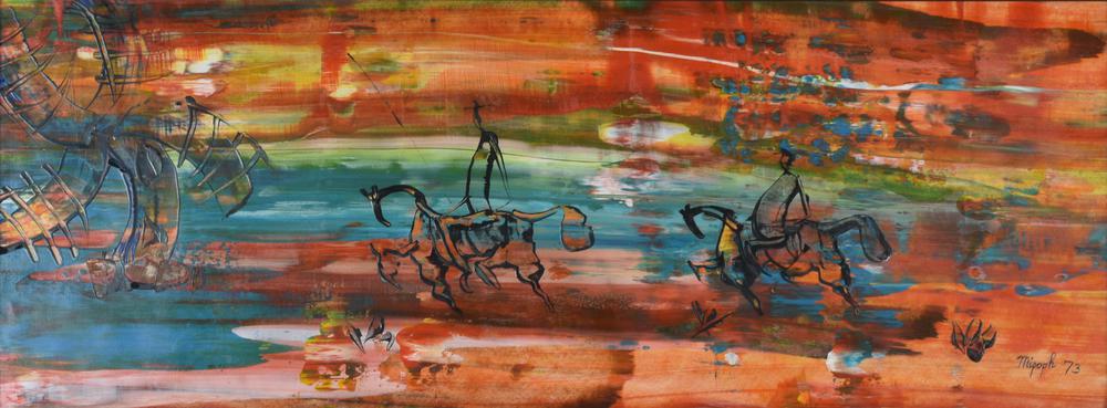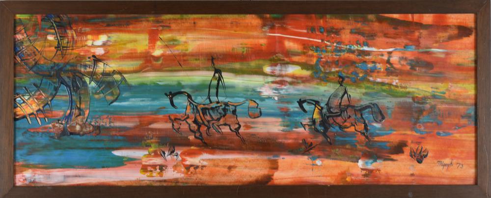 Mipoph DON CHISCIOTTE olio su tavola, cm 65x25 sul fronte: firma e data...