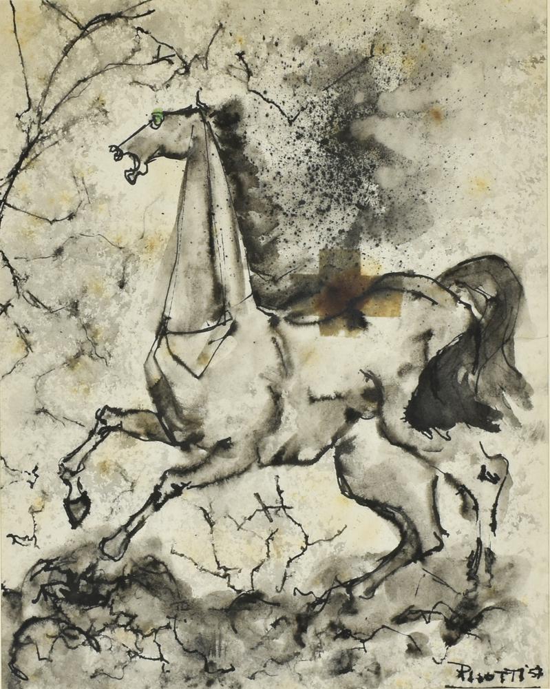 Paolo Pisotti CAVALLO acquerello e china su carta, cm 27,5x22 sul fronte:...