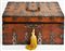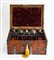 Cofanetto in noce con rinforzi in ferro, all'interno flaconi da toilette in...