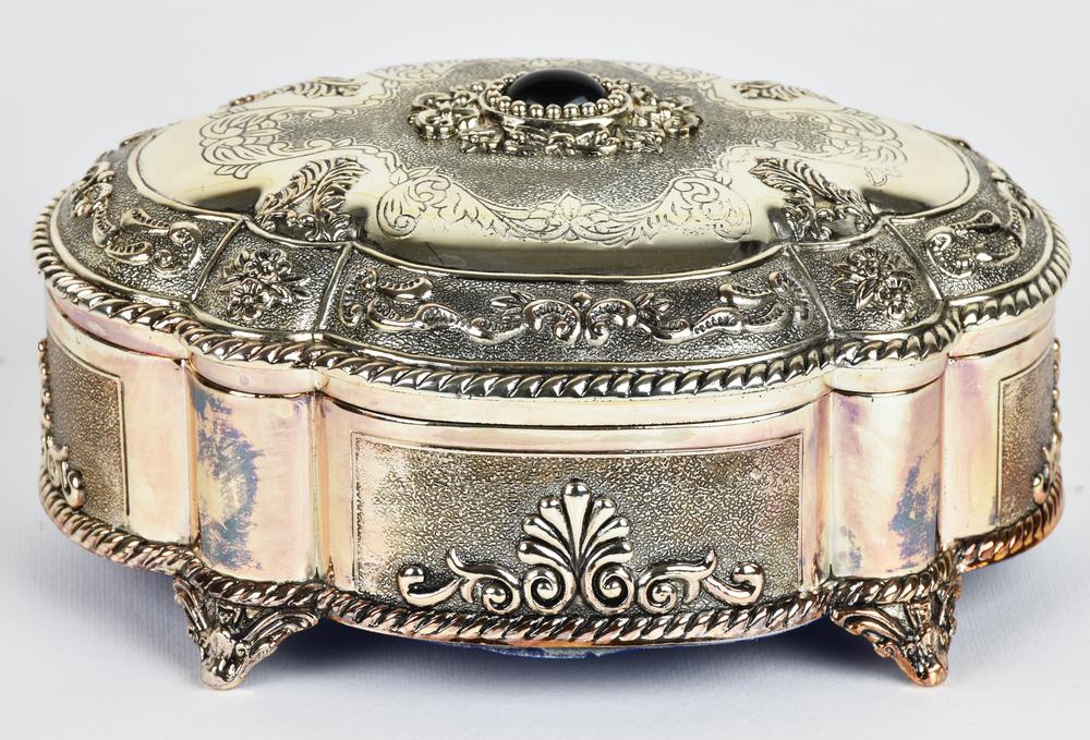 SCATOLA PORTAGIOIE in metallo argentato, di forma sagomata con interno in...