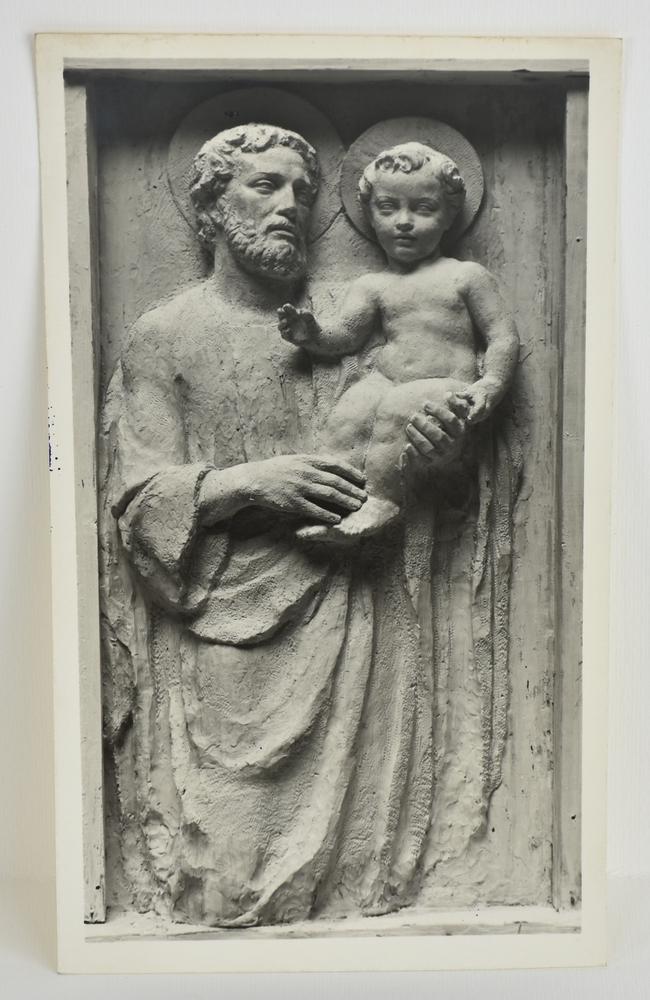 in bianco e nero raffigurante bassorilievo con Giuseppe e il Bambino Gesω, cm 23x13,5
