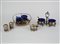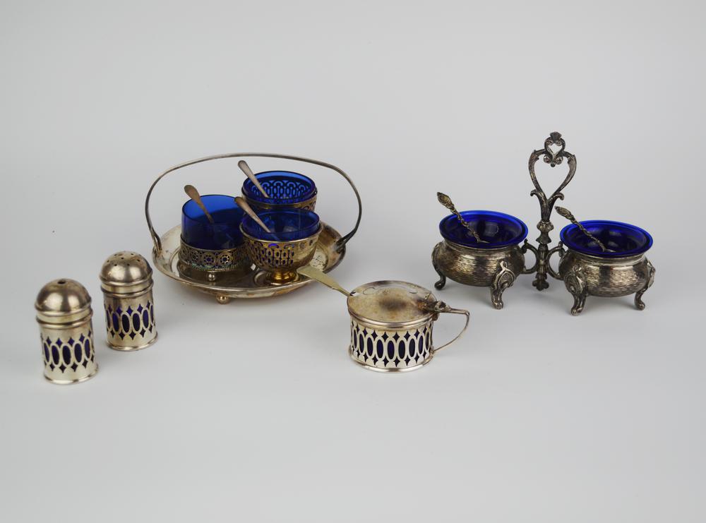 Coppia di saliere in metallo argentato e vetro blu con vassoietto e senapiera