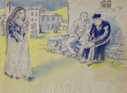 Aligi Sassu (Milano, 1912 - 2000) Figure in paese Acquerello su carta, cm. 24,2x34,5 Firma in basso a destra. Sul verso: timbri Archivio Fotografico Mondadori; a penna: "Aligi Sassu/Disegno per «La tomba di Lazzaro» di Ignazio Silone (Una manciata di more)".