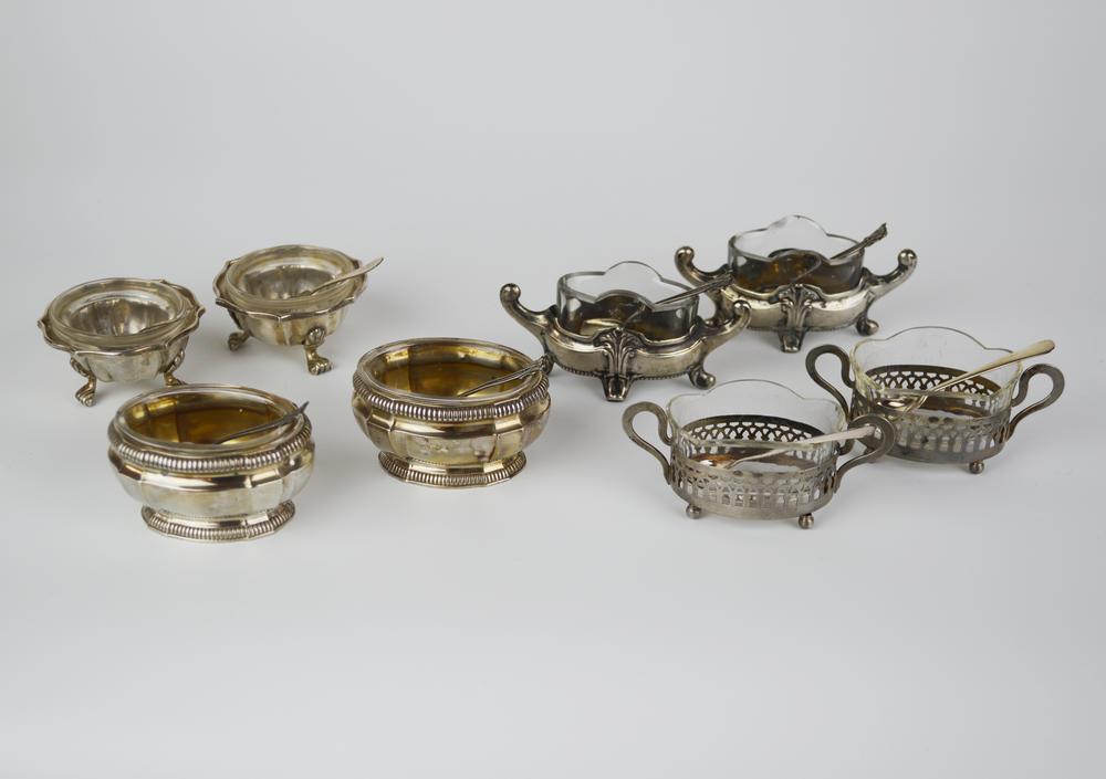 Quattro coppie di saliere in argento di cui due modellate a cestino e due a vaschetta tutte con interno in vetro trasparente, complete di cucchiaino