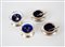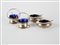 Coppia di saliere in argento a piccolo cestino e altra coppia a disco. Tutte con interni in vetro blu e complete di cucchiaini.