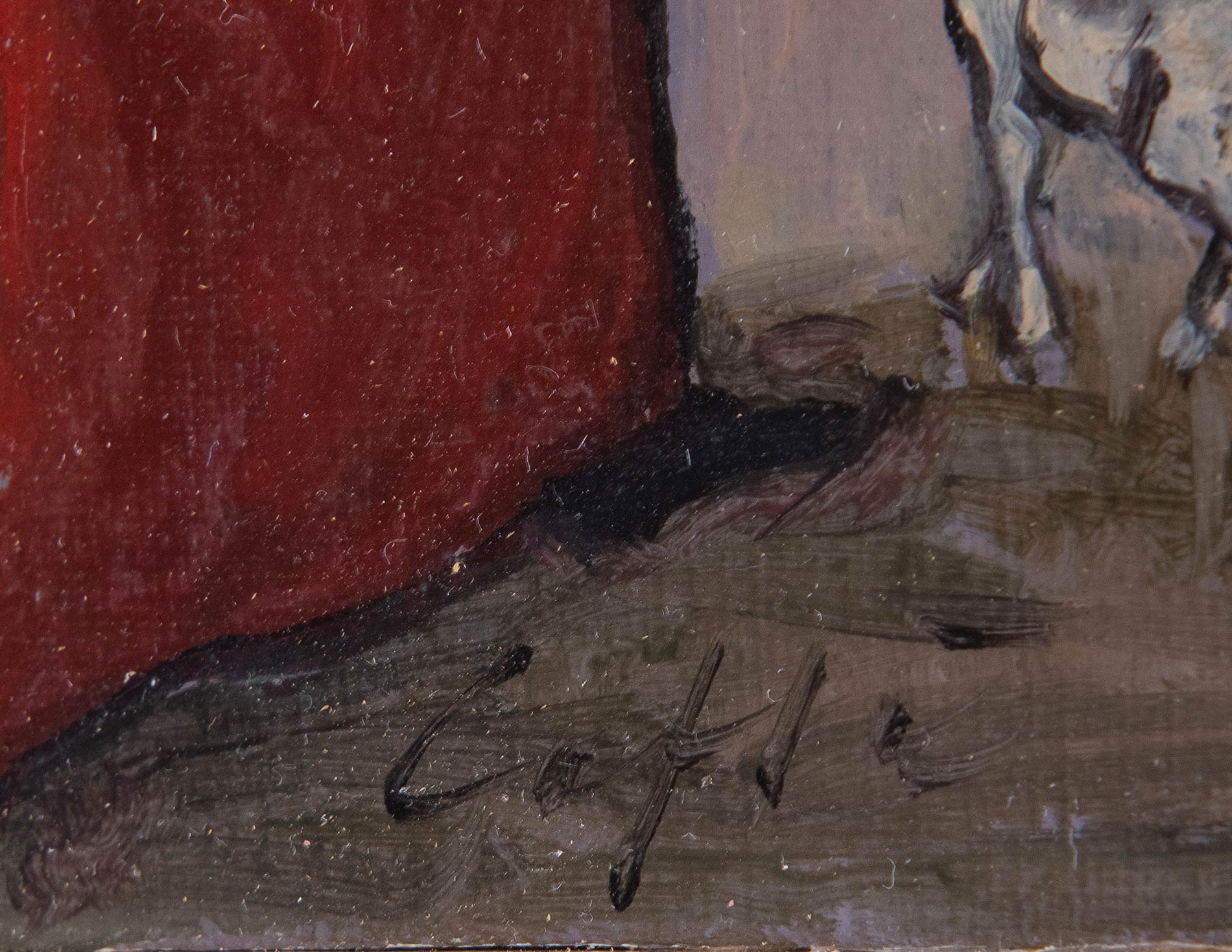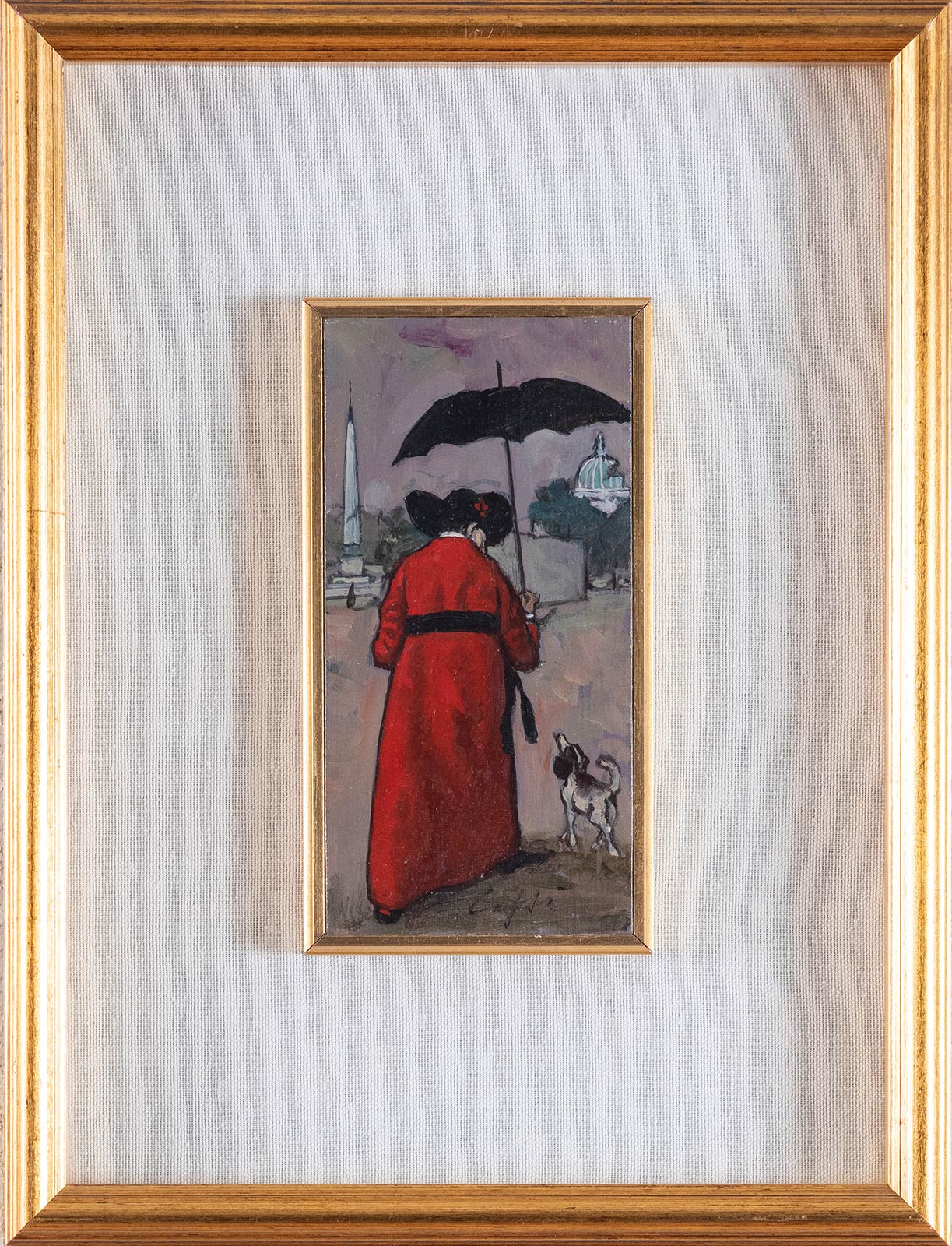 NINO CAFFE' (Alfedena 1908 - Pesaro 1975). 'Prete con cagnolino', 1971. Olio su tela. H. Cm 20x10. Opera firmata in basso 'Caffè'. Opera firmata e datata al retro 'Caffè 1971'.