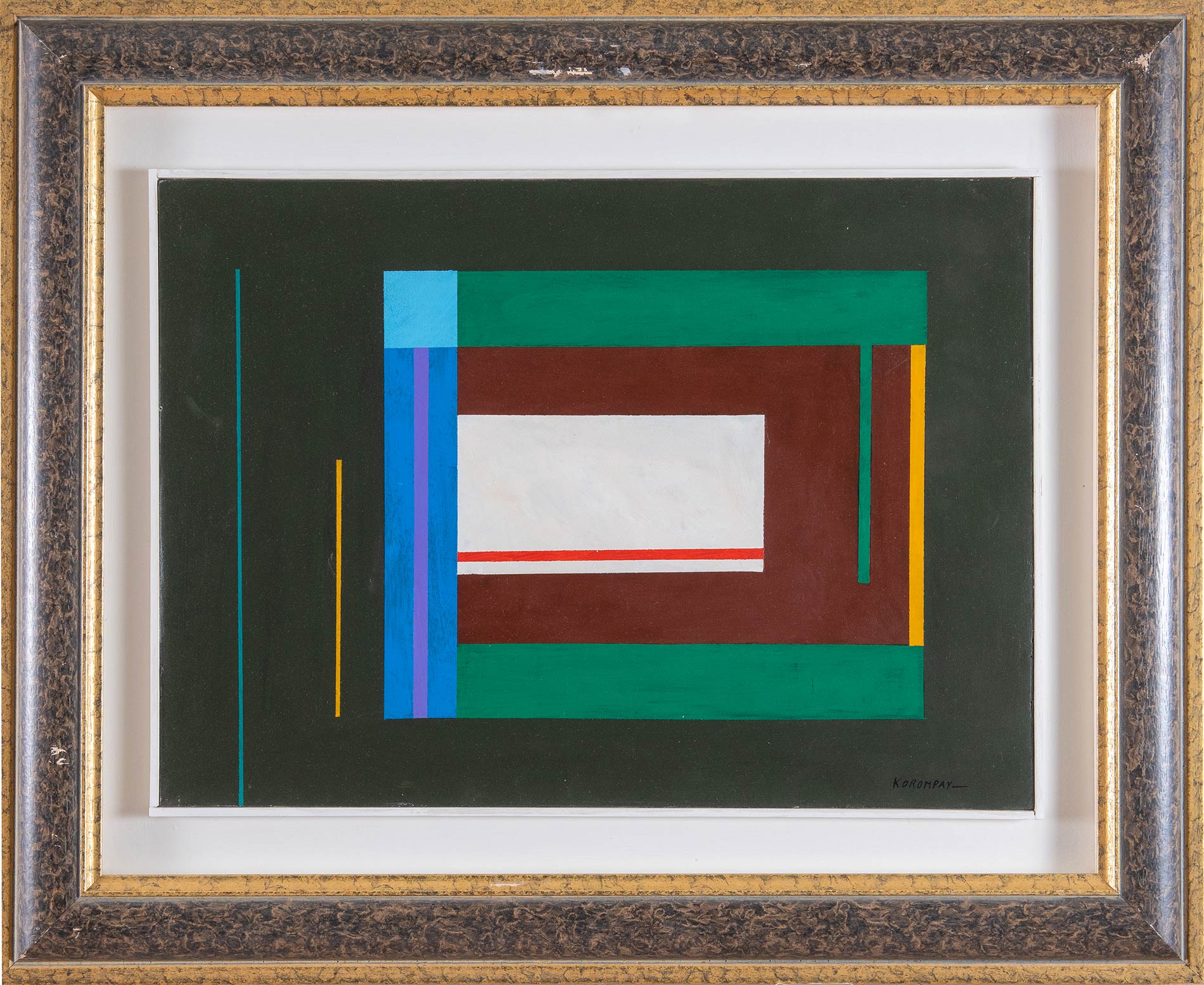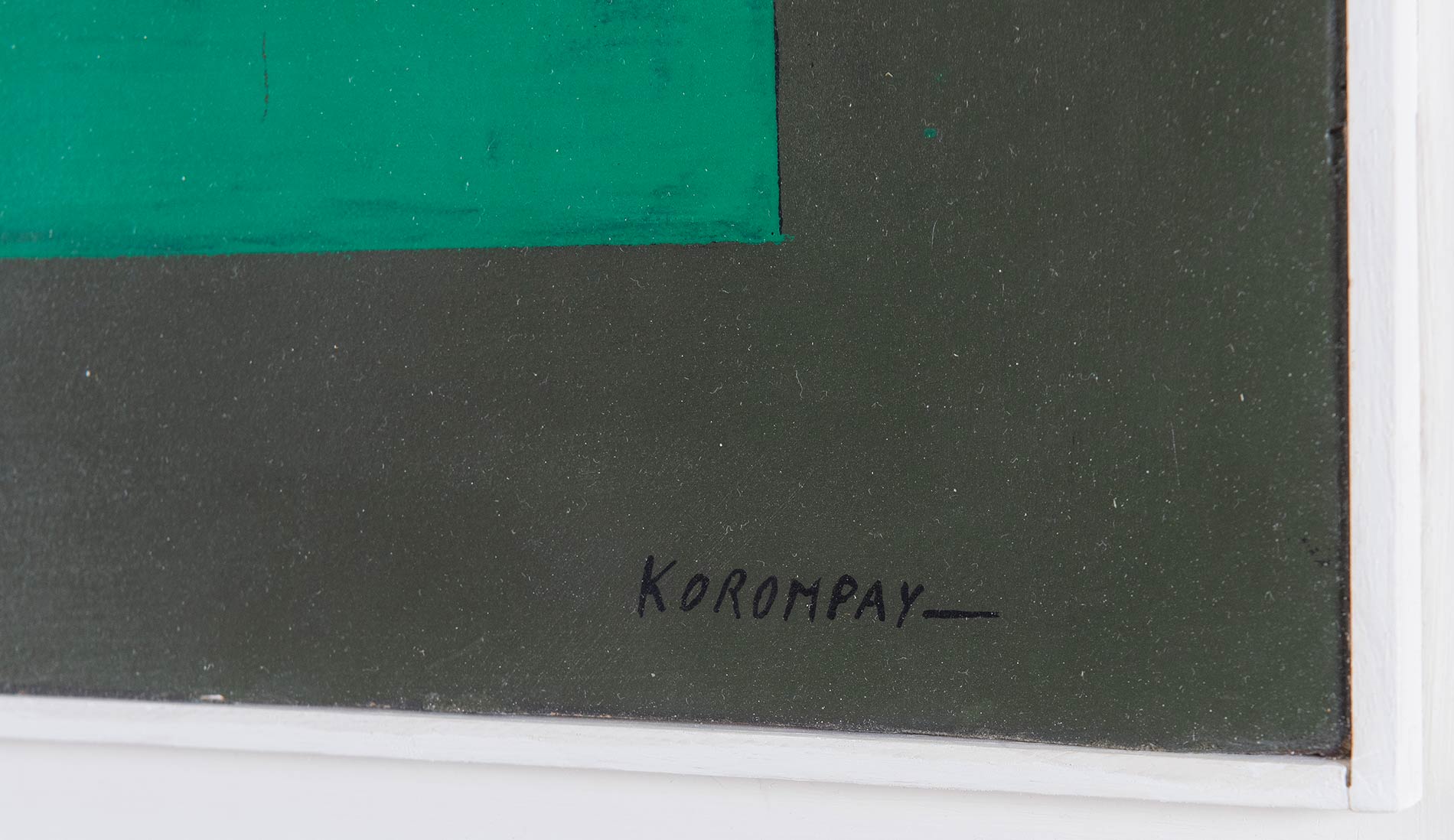 GIOVANNI KOROMPAY (Venezia 1904 - Rovereto 1988). 'Composizione'. Olio su faesite. H. Cm 40x56. Opera firmata in basso a destra 'Korompay'. Al retro reca timbro con firma 'Archivio Collettivo Artisti Contemporanei'.