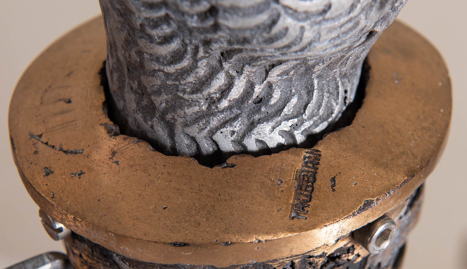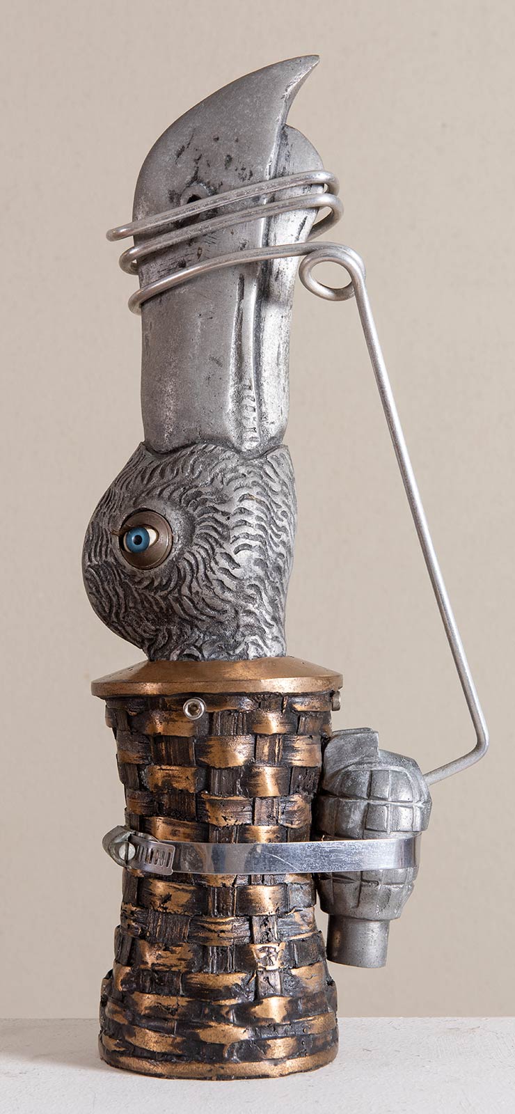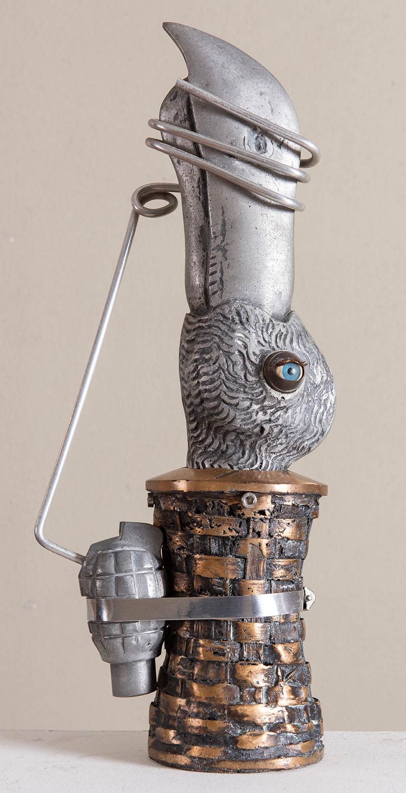 VALERIANO TRUBBIANI (Macerata 1937). 'Chiudere il becco', 1975. Scultura in bronzo e acciaio, esemplare unico. H. Cm 48,5. Opera firmata nel cerchio di bronzo al centro 'Trubbiani'. Reca etichetta alla base 'Opera esposta in occasione della mostra orme del '900, Predappio 2009', firmata dall'Assessore alla cultura Avv. Gianluca Barravecchia. Reca timbro alla base. Opera pubblicata a colori in catalogo 'Predappio 2009'.
