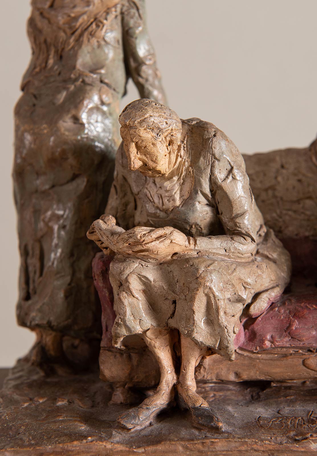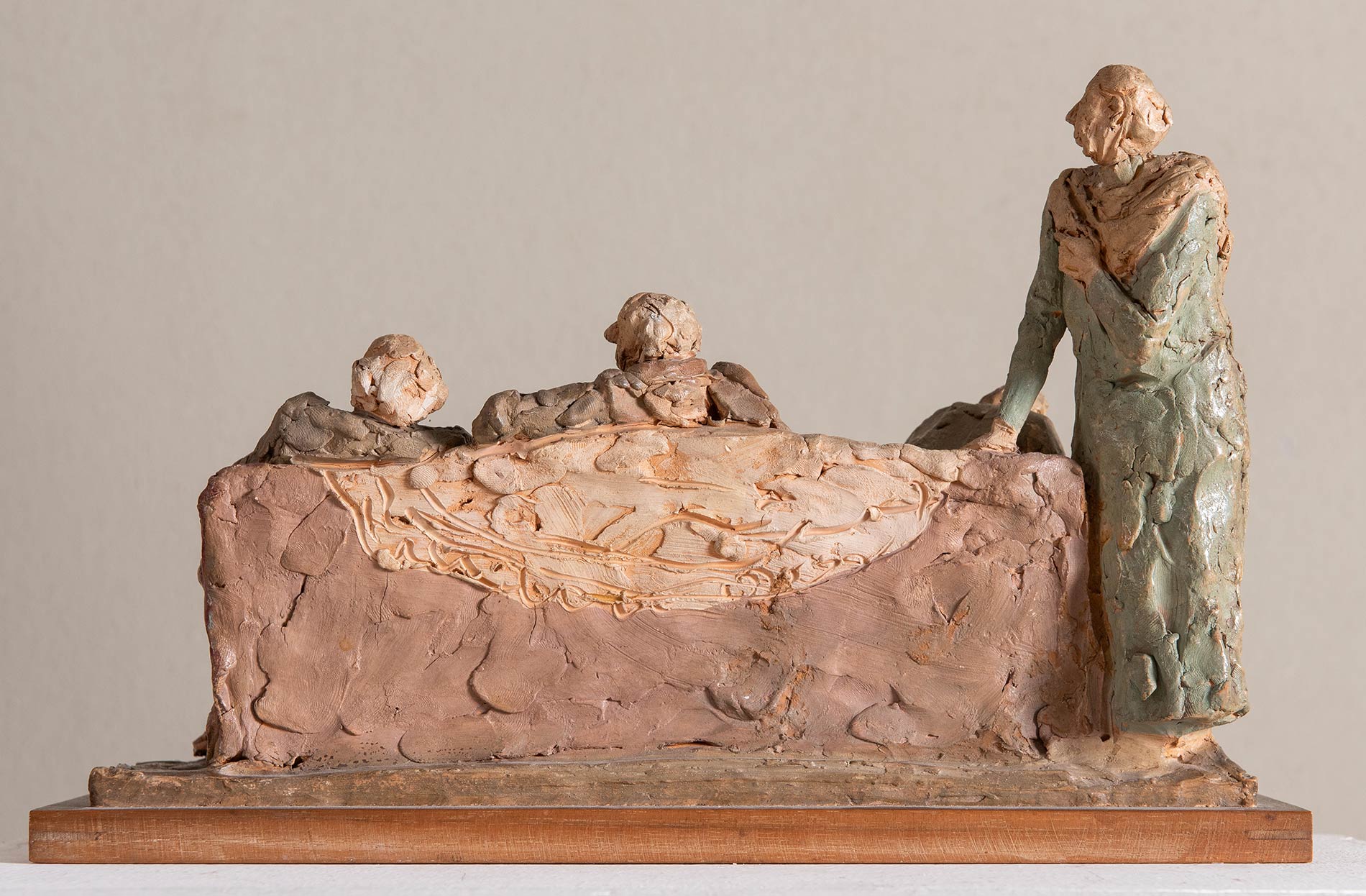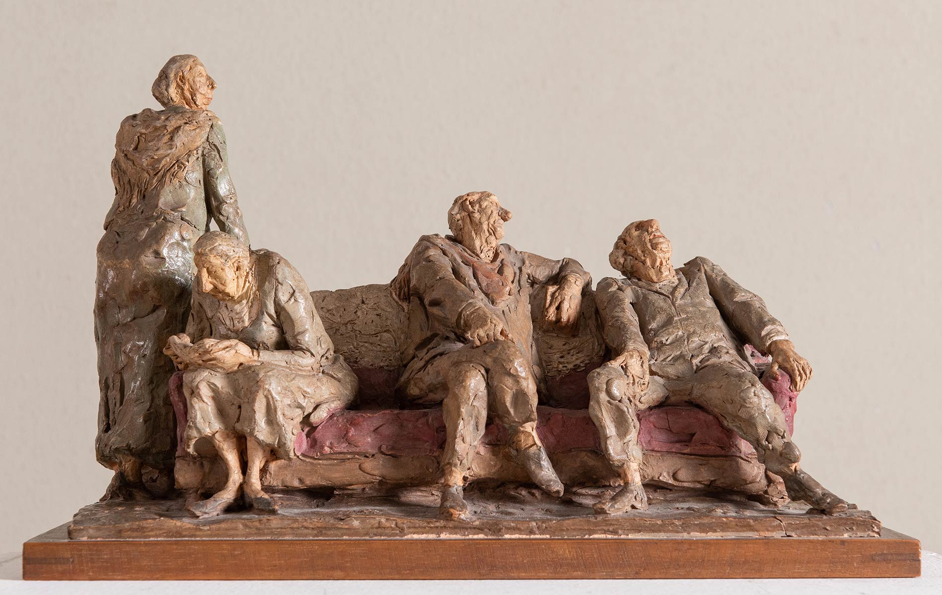 CLETO TOMBA (Castel San Pietro Terme 1898 - Bologna 1987). 'Gli artisti', anni'40. Scultura in terracotta policroma. H. Cm 21,5x31x11. Firmata alla base in basso a destra 'Tomba'. Reca timbro a destra 'T'.