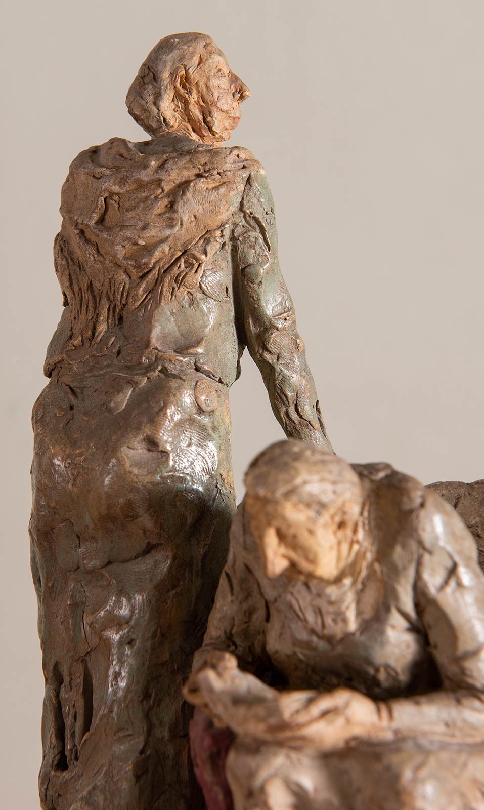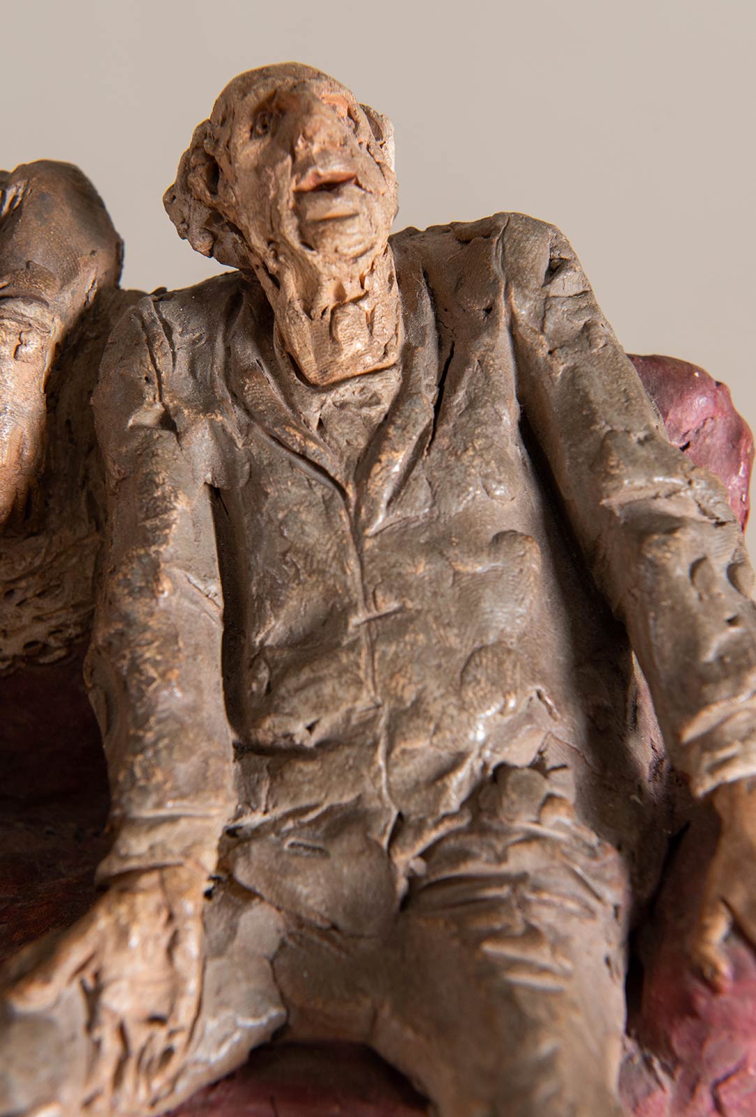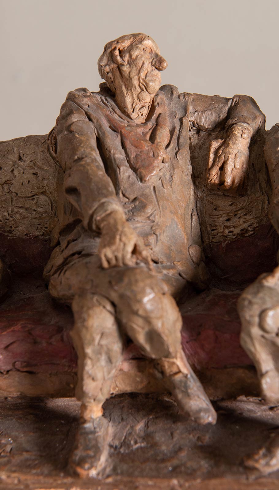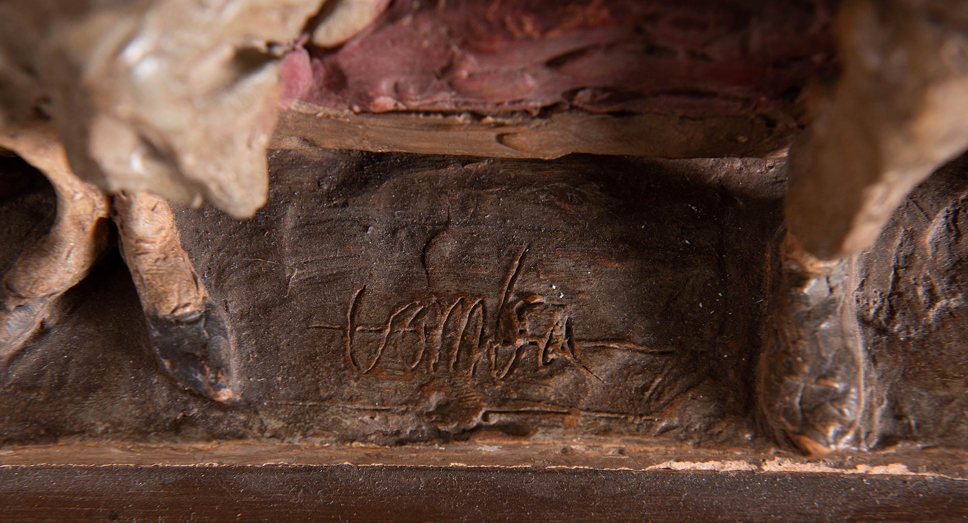 CLETO TOMBA (Castel San Pietro Terme 1898 - Bologna 1987). 'Gli artisti', anni'40. Scultura in terracotta policroma. H. Cm 21,5x31x11. Firmata alla base in basso a destra 'Tomba'. Reca timbro a destra 'T'.