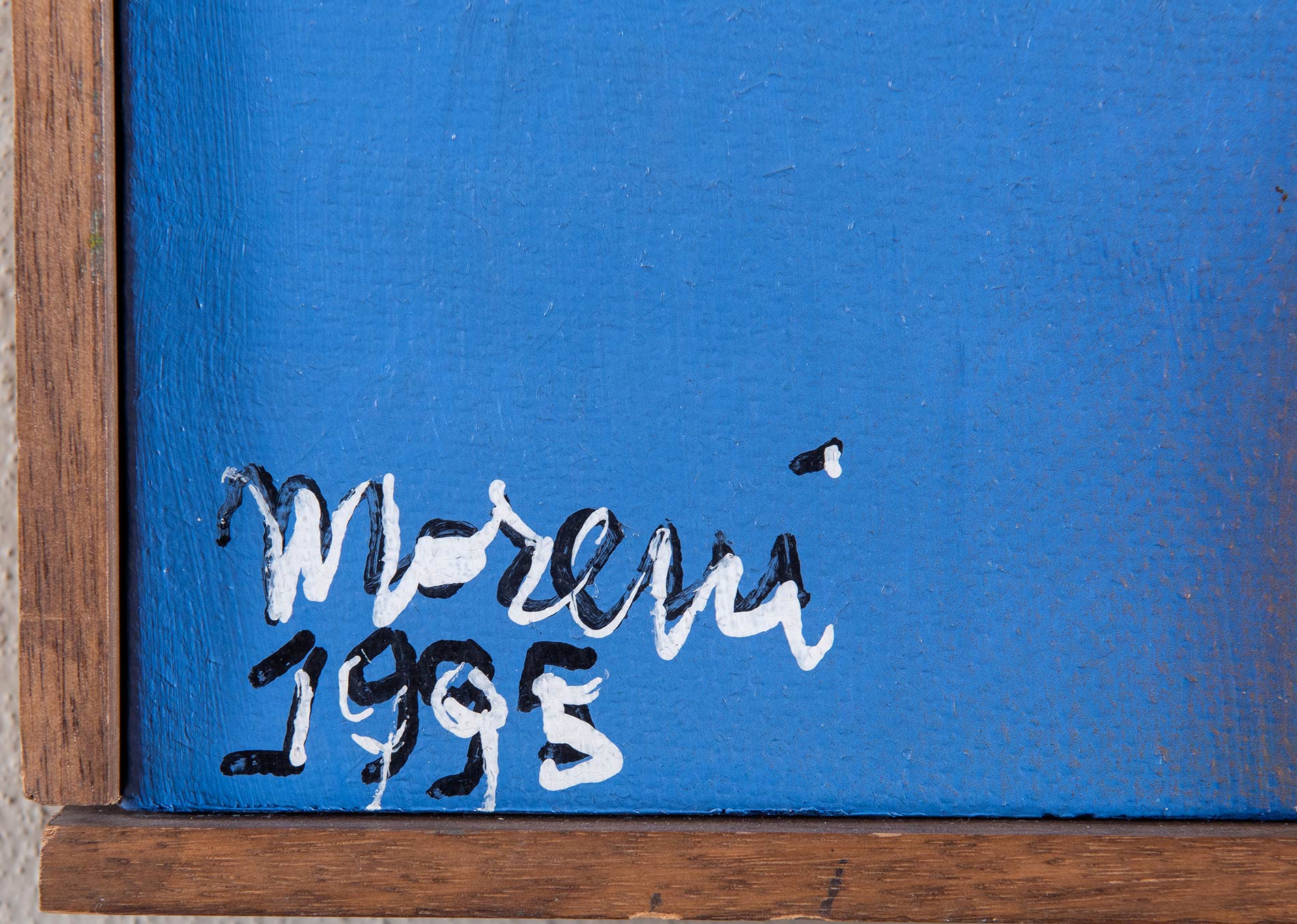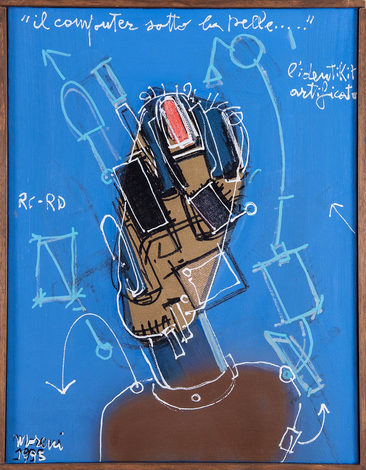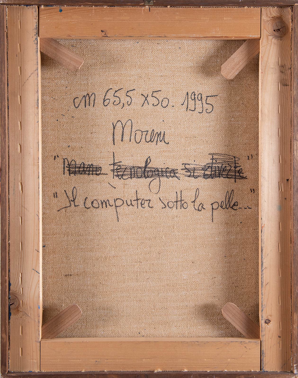 MATTIA MORENI (Pavia 1920 - Brisighella 1999). 'Il Computer Sotto La Pelle', 1995. Olio su Tela. H. Cm 65×50. Opera firmata e datata in basso a sinistra 'Moreni 1995'. Opera datata, firmata e intitolata al retro 'Moreni 1995 'Il Computer Sotto La Pelle''.
