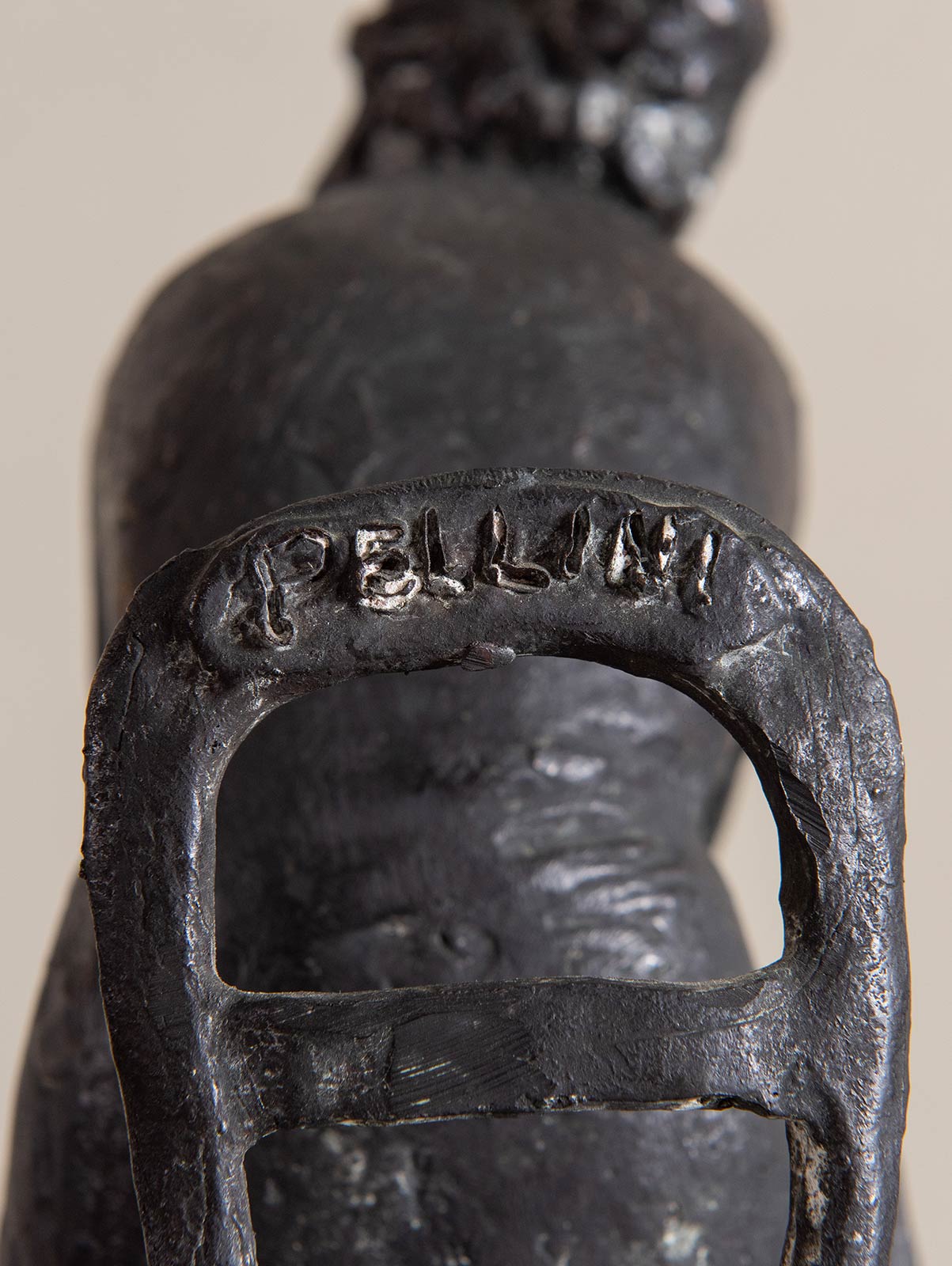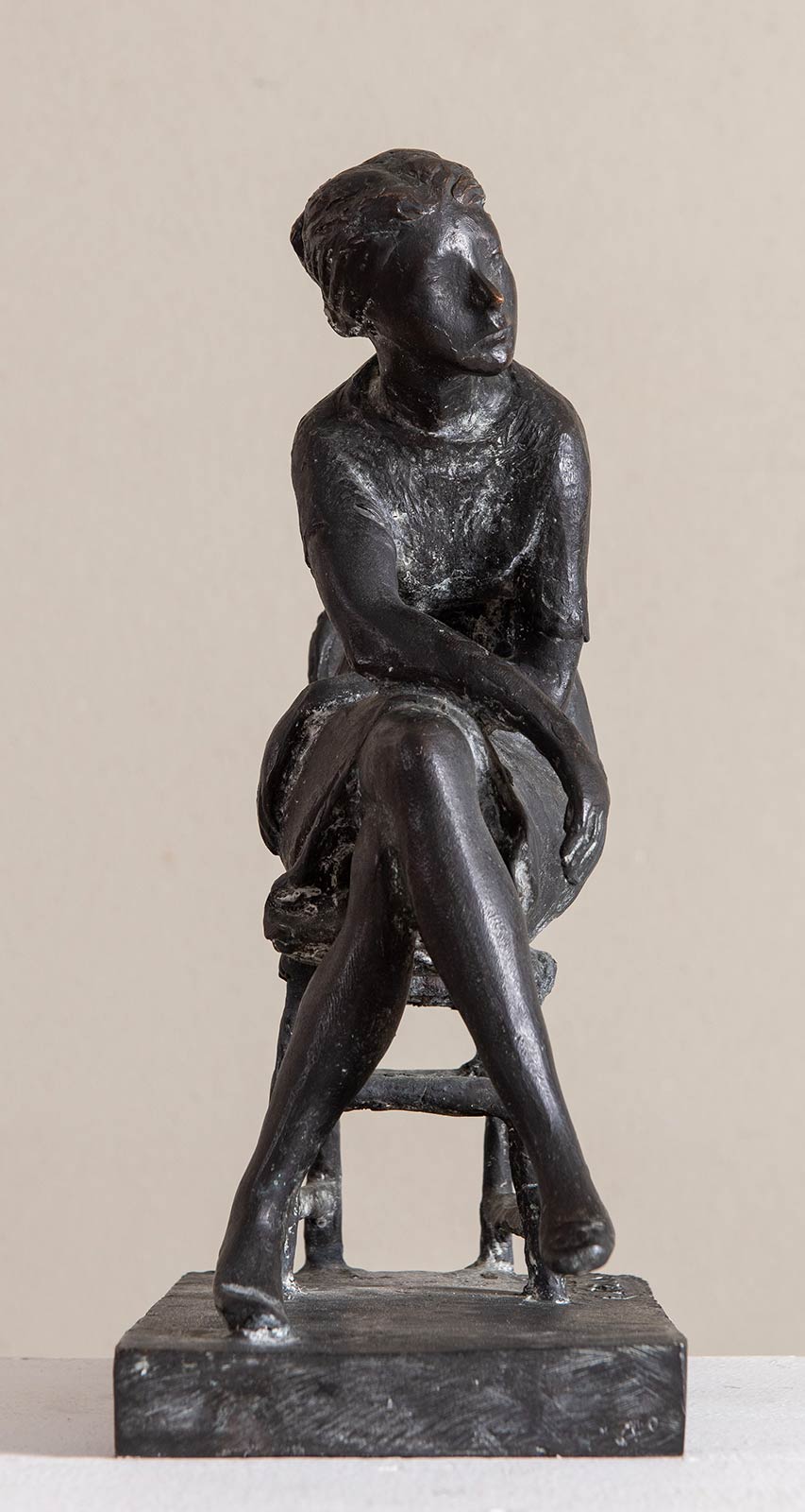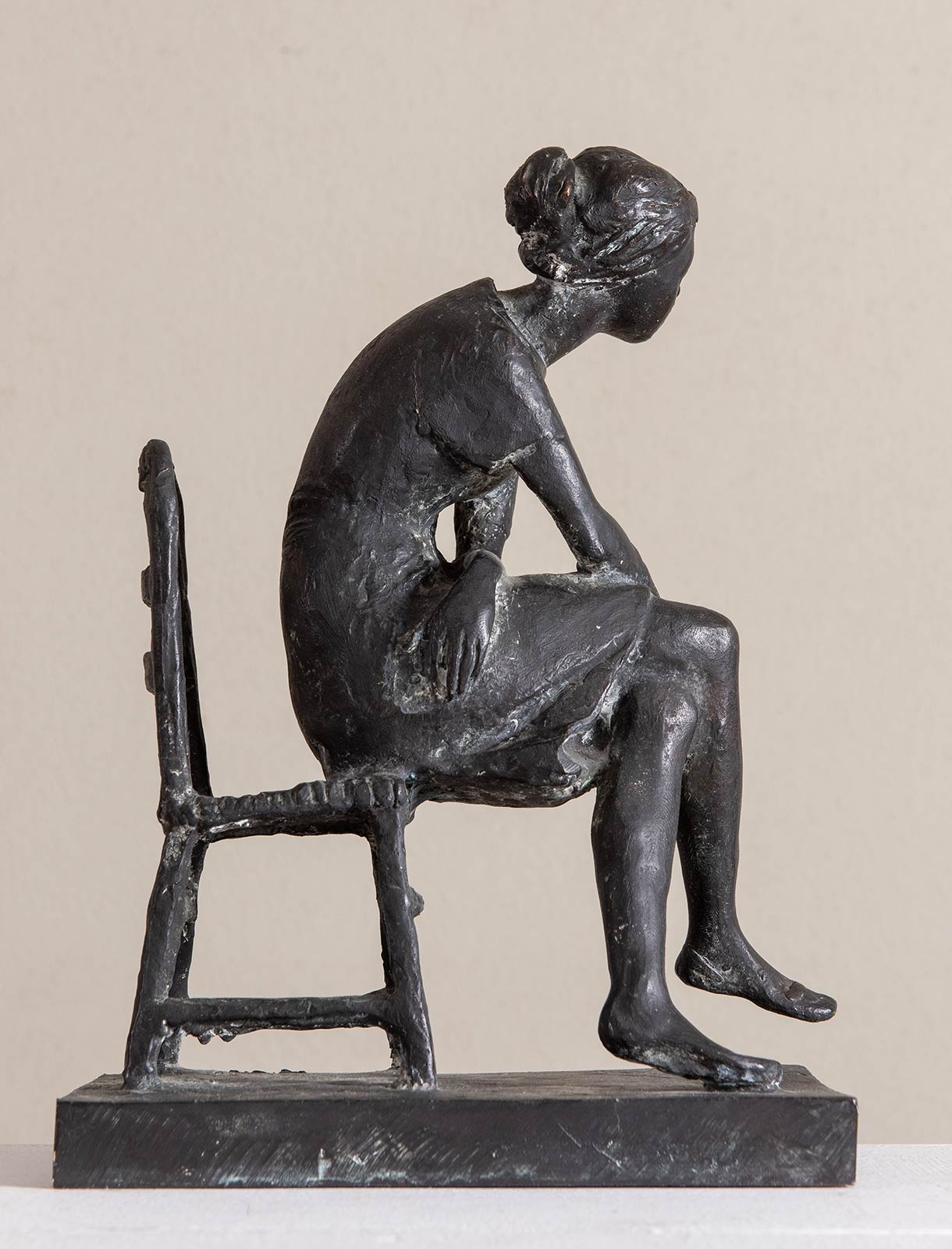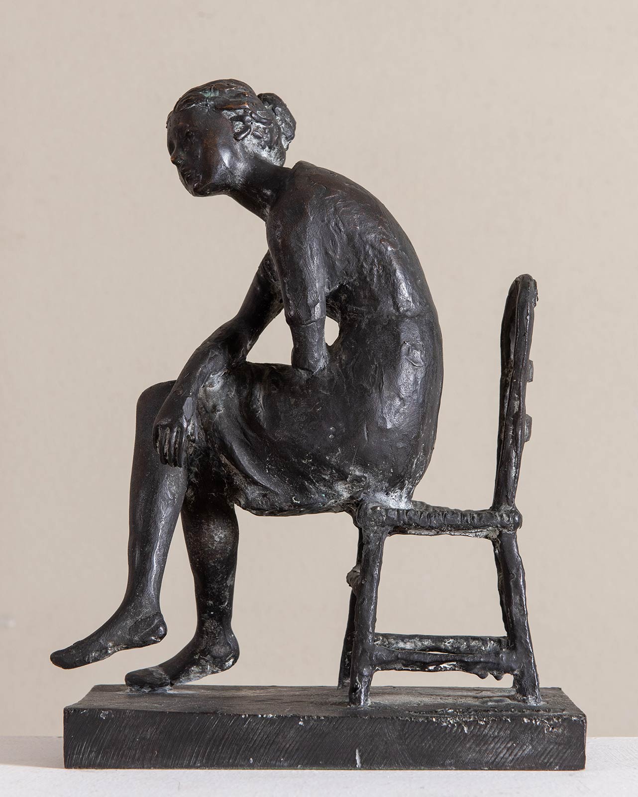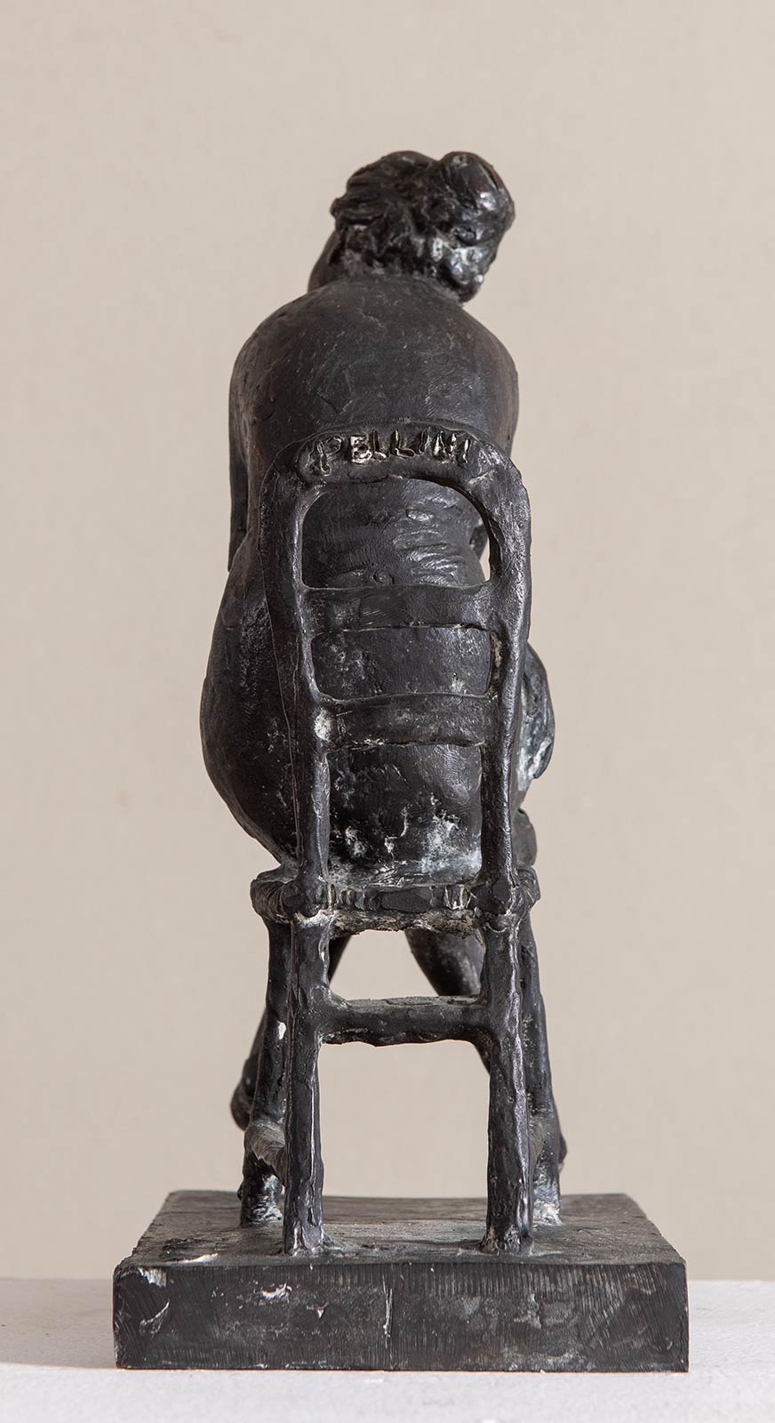 EROS PELLINI (Milano 1909 - Milano 1993). 'Donna seduta'. Scultura in bronzo brunito. H. Cm 31x21,8x12,5. Opera firmata alla base 'Pellini', reca altra firma nel retro della sedia 'Pellini'.