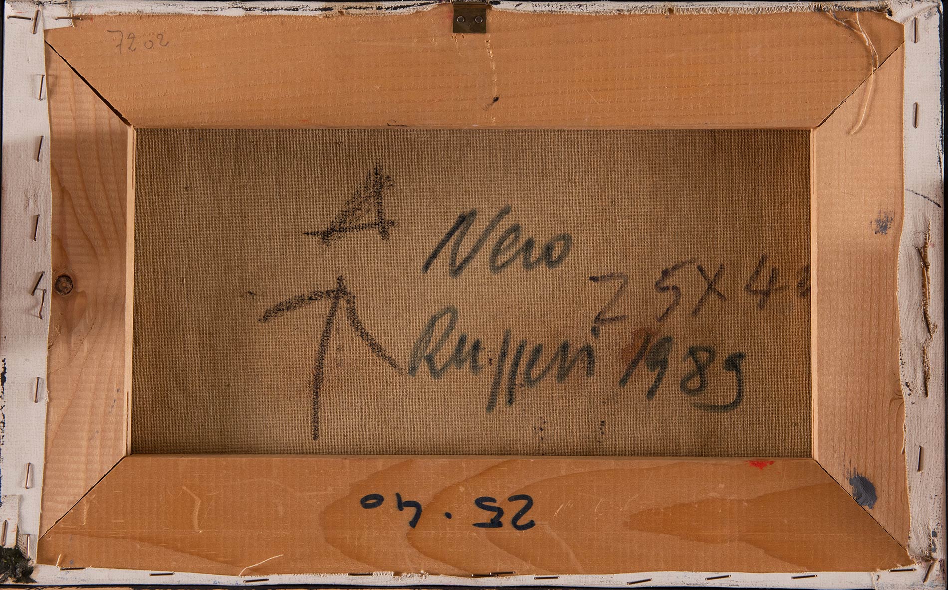PIERO RUGGERI (Torino 1930). 'Nero', 1989. Olio su tela. H. Cm 25x40. Opera intitolata, firmata e datata al retro 'Piero Ruggero, 'Nero' 1989'.