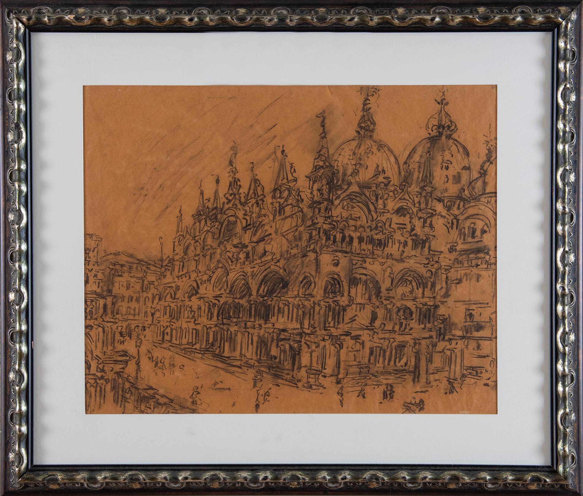 EMILIO VEDOVA (Venezia 1919 - Venezia 2006). 'Architettura Veneziana - Basilica di S. Marco', 1936. Carboncino su carta. H. Cm 47,5x50,5. Opera accompagnata da autentica su fotografia firmata dall'artista con timbro di relativo numero di archivio 'Emilio Vedova, Archivio Venezia; autentica numero 532, del 21/03/00'.