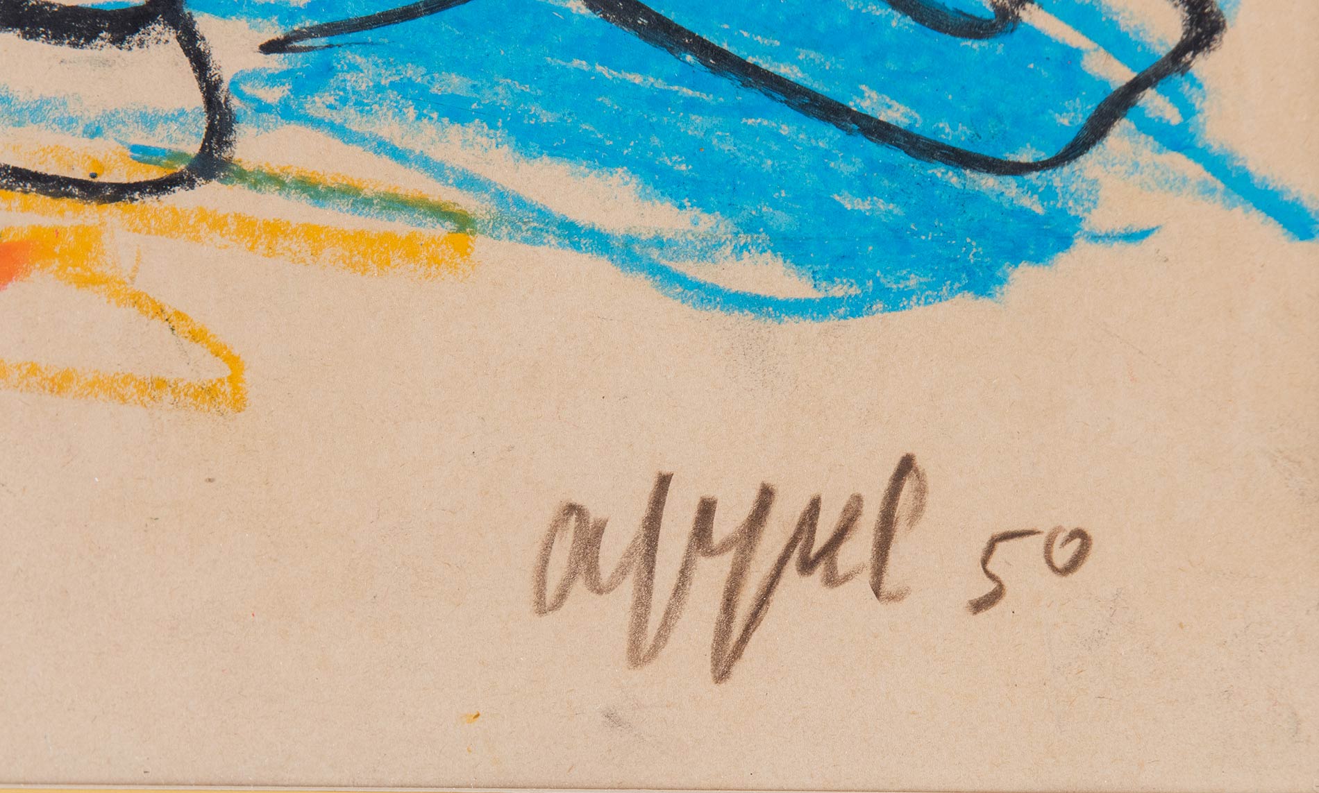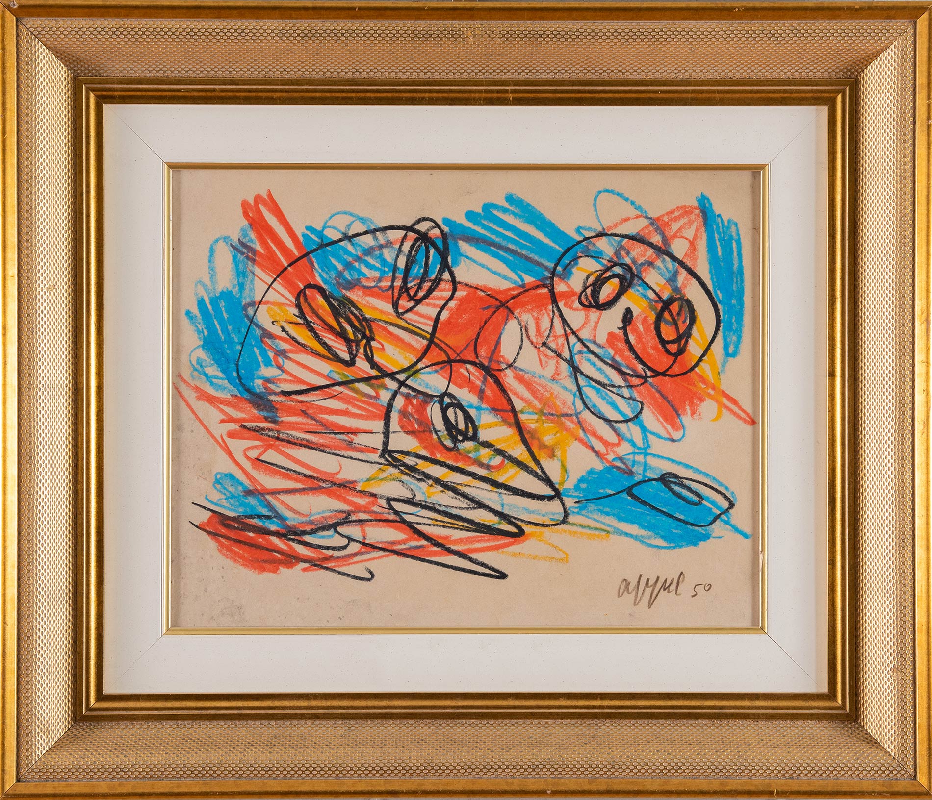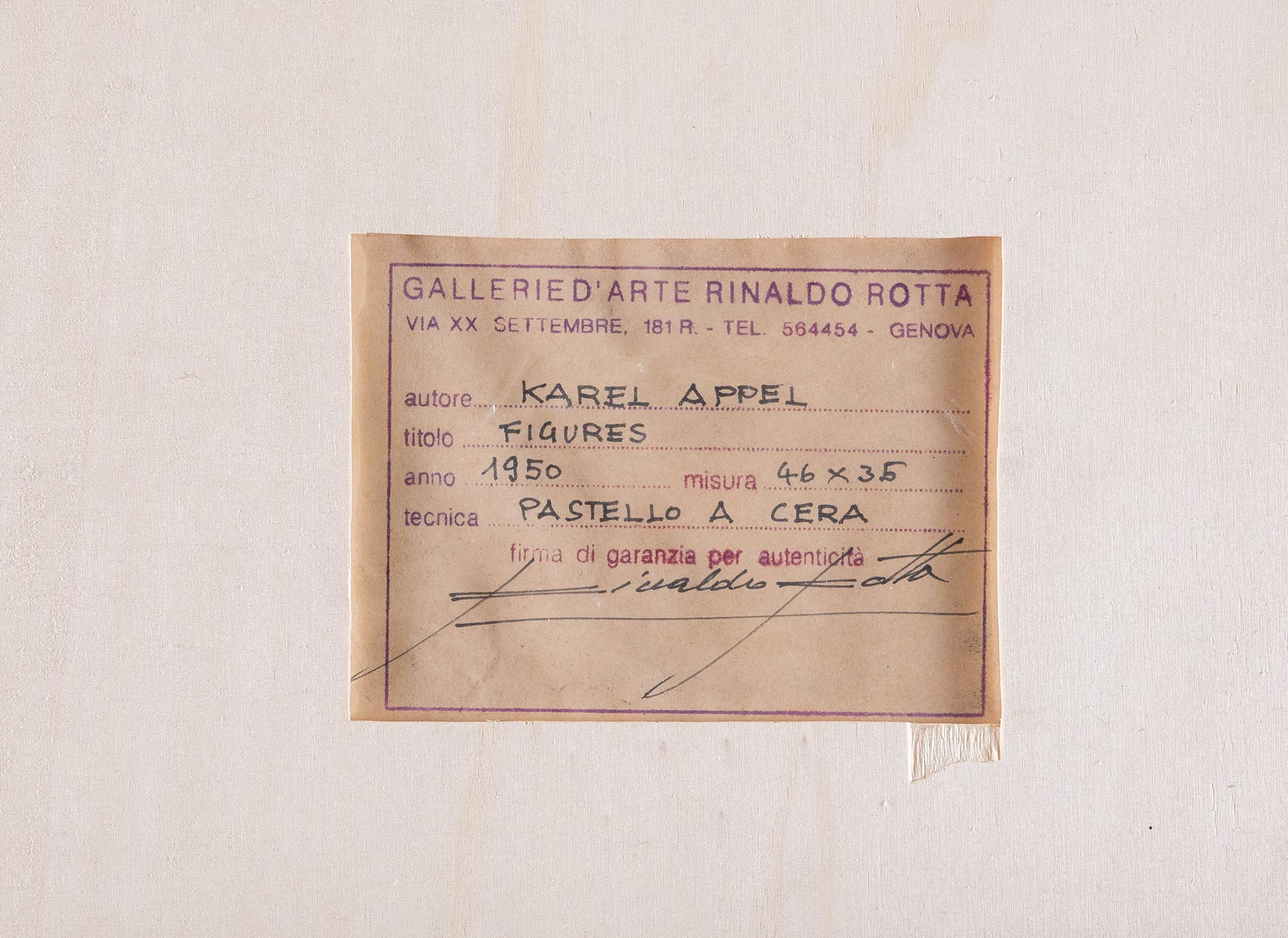KAREL APPEL (Amsterdam 1921 - Zurigo 2006). 'Figures', 1950. Pastello a cera su carta applicata su tavola. H. Cm 35x46. Opera firmata e datata in basso a destra 'Appel 50'. Al retro reca timbro 'Galleria d'Arte Rinaldo Rotta, Genova' con firma per autenticità 'Rinaldo Rotta'. Opera accompagnata da autentica su fotografia firmata dall'artista con timbro 'Galleria d'Arte Rinaldo Rotta' e firma 'Rinaldo Rotta'.