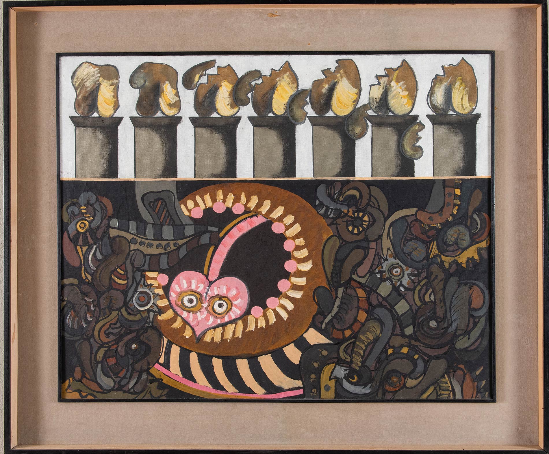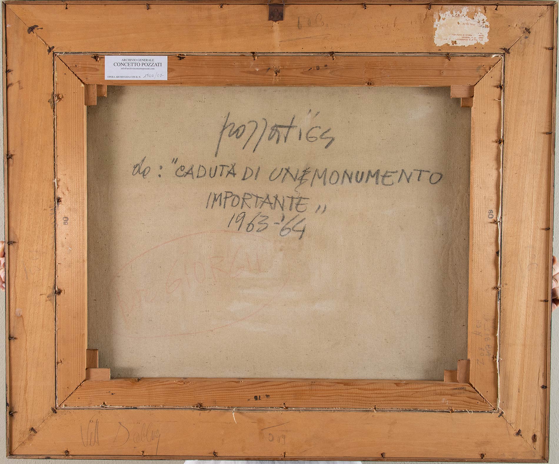 CONCETTO POZZATI (Vo' 1935 - Bologna 2017). 'Da: caduta di un monumento importante', 1963-1964. Olio su tela. H. Cm 60x75. Opera firmata in alto a sinistra 'Pozzati'. Al retro opera firmata, intitolata e datata 'Pozzati 'Da: caduta di un monumento importante' 1963-64'. Al retro reca inoltre etichetta della mostra 'Pozzati 1958-68; Esposizione Salone Farnese in Pilotta, Parma'. Provenienza: ex Collezione De Dominicis, Roma. Opera registrata all'archivio generale Concetto Pozzati con il numero 1566/07. Opera accompagnata da autentica su foto dell'archivio generale Concetto Pozzati; sono presenti diverse fotografie del maestro con l'opera. Pubblicazioni: 'Catalogo generale delle opere di Concetto Pozzati', 'Salone Farnese in Pilotta, Parma 1968'.