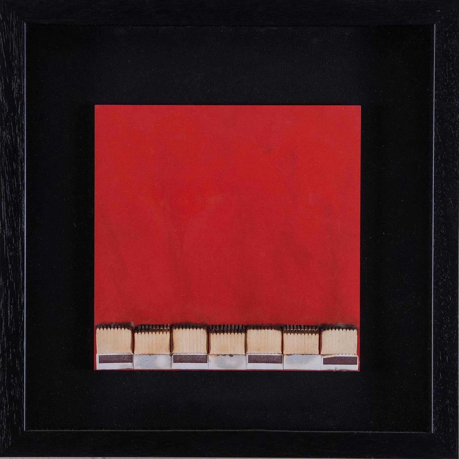 BERNARD AUBERTIN (Fontenay-aux-Roses 1934 - Reutlingen 2015). 'Senza titolo', 2008. Collage di fiammiferi bruciati su tavola rossa. H. Cm 30x30. Opera firmata e datata al retro 'Bernard Aubertin 2008'. Opera accompagnata da autentica su fotografia firmata dall'artista.
