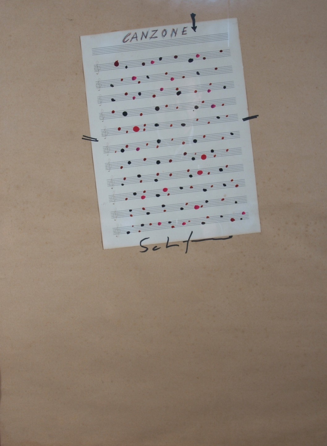 Tecnica mista e collage su carta povera, etichetta al retro Reggia di Caserta, mostra antologica di Mario Schifano dal 12 al 26 dicembre 2004.