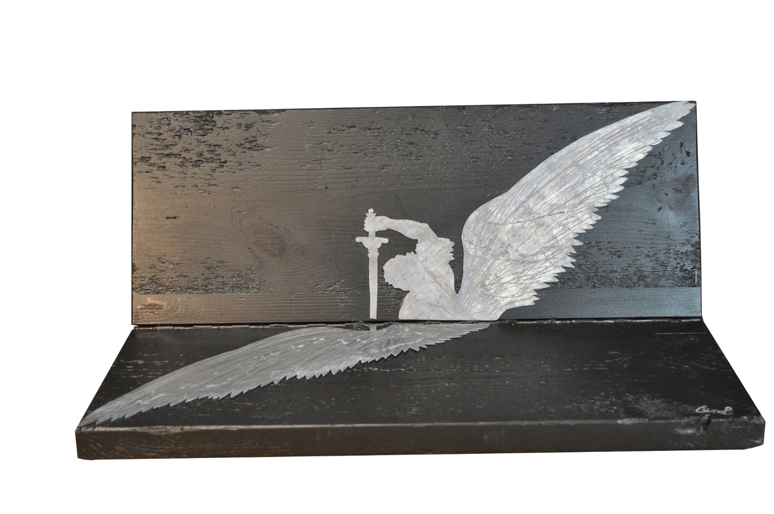CEROLI MARIO L'angelo vendicativo, Scultura realizzata con particolare procedimento d'intaglio a mano da lastra di piombo applicata