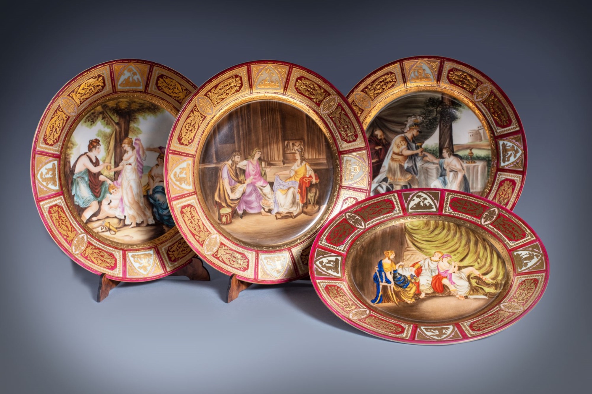 Quattro piatti in porcellana, secolo XX, raffiguranti scene mitologiche